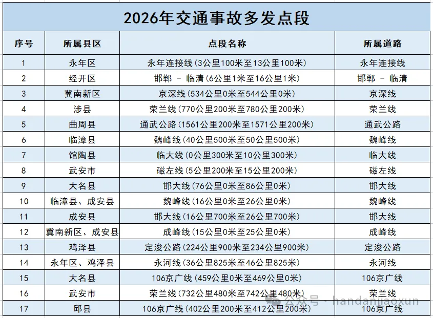 邯郸交巡警温馨提示:行经事故多发路段,请各位驾驶人谨慎驾驶,安全出行。驾车出行应提前掌握交通路况信息和交通安全提示,合理安排好出行时间,提前规划并熟悉路线。