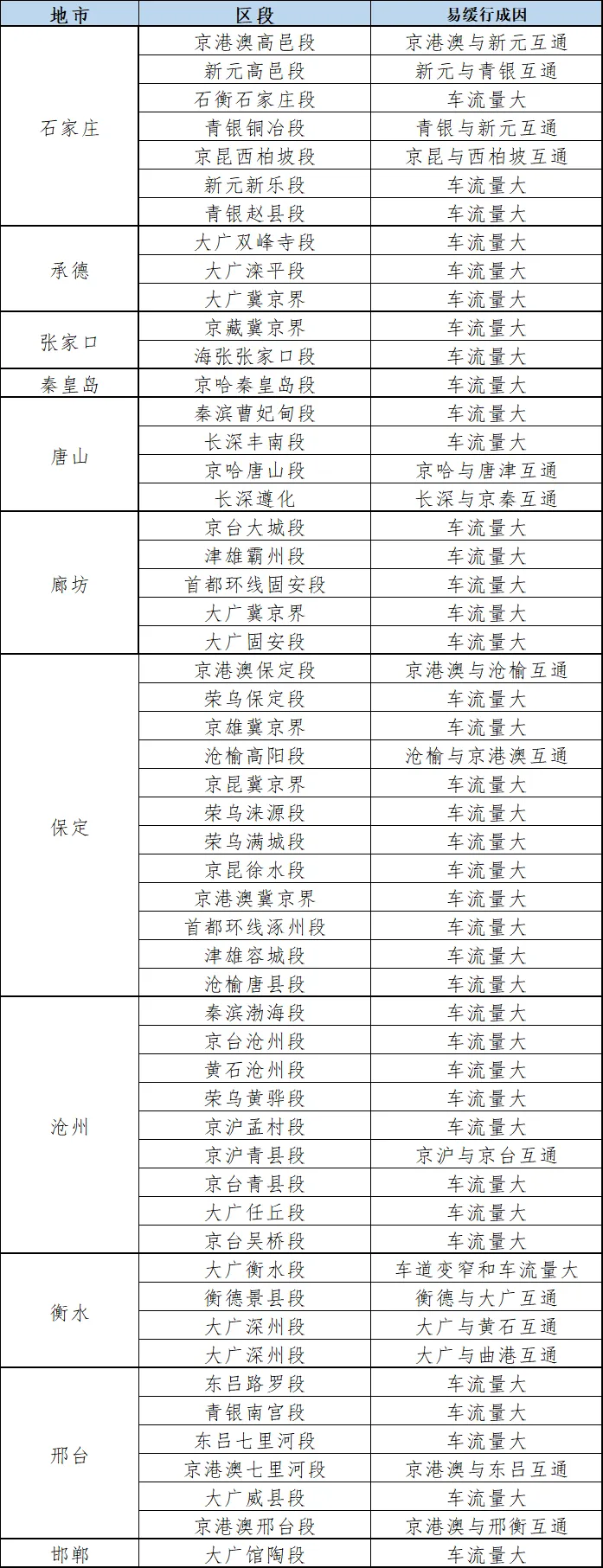 高速公路易发缓行点位主要集中在京港澳、京昆、青银、京沪、京台、大广等主要通道。其中,沧榆高速高阳段、青银高速赵县段、京藏高速冀京界、京港澳高速保定段、京昆高速西柏坡段、京雄高速冀京界、京沪高速青县段、大广高速衡水段、大广高速深州段易出现缓行情况。