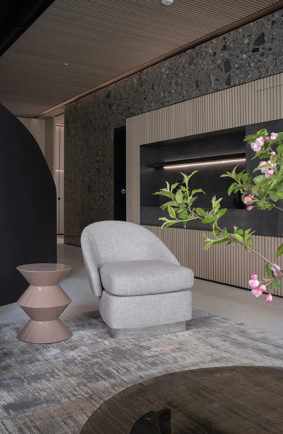 在室内设计风格的体现上,主题“一道和光,温润沁人”是整个项目的灵魂。设计风格可以归类为极致的现代简约,但绝非冰冷的“少即是多”。它更接近于东方意境的现代写意,强调空间的流动感、材料的原生质感与光影的叙事性。线条被极致简化,空间界面(墙、顶、地)处理得干净利落,所有造型和细节都谦逊地为“光”这一主角让路,共同营造出一种令人心境平和的“温润”感。