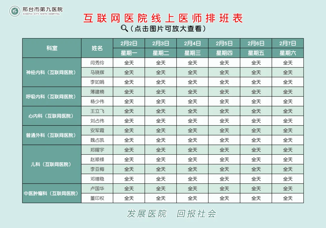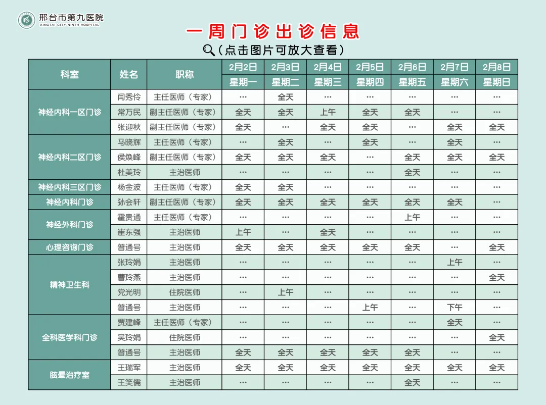 >邢台市第九医院2月2日——2月8日门诊出诊安排