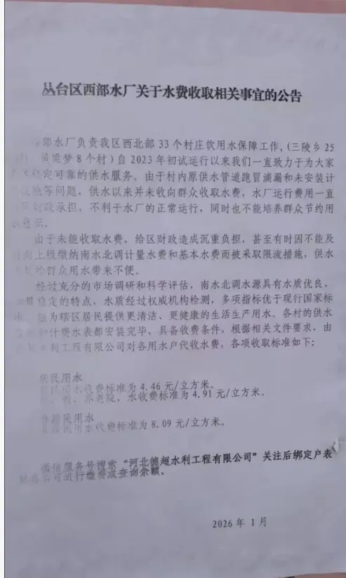 这几天有网友提供邯郸《丛台区西部水厂关于水费收取相关事宜的公告》,此收费文件真假未知,本文只是就是论事,不存在任何立场。