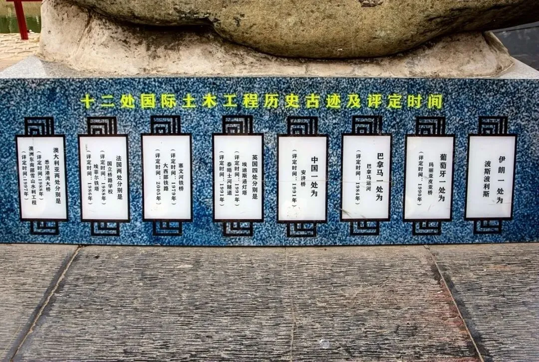 下图是这十二处国际土木工程的历史古迹和评定时间。也就是说,赵州桥和埃及金字塔、巴拿马运河、法国埃菲尔铁塔等世界历史建筑古迹已并列在同等地位了。赵州桥的“坦弧”,就是桥面比较平坦,拱得不太厉害;“敞肩拱”,就是桥两侧拱肩部分各建有两个对称的小拱,能省料,减轻,增加泄洪能力,增强抗震性能,开创了世界桥梁史先河,比欧洲同类桥梁早了1200年(欧洲最早为19世纪)。[待续]