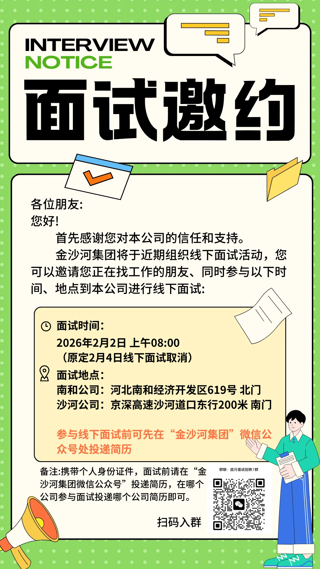 2月2日早上8:00在南和、沙河公司门岗组织线下面试,有意向者可携带身份证到现场参加线下面试!