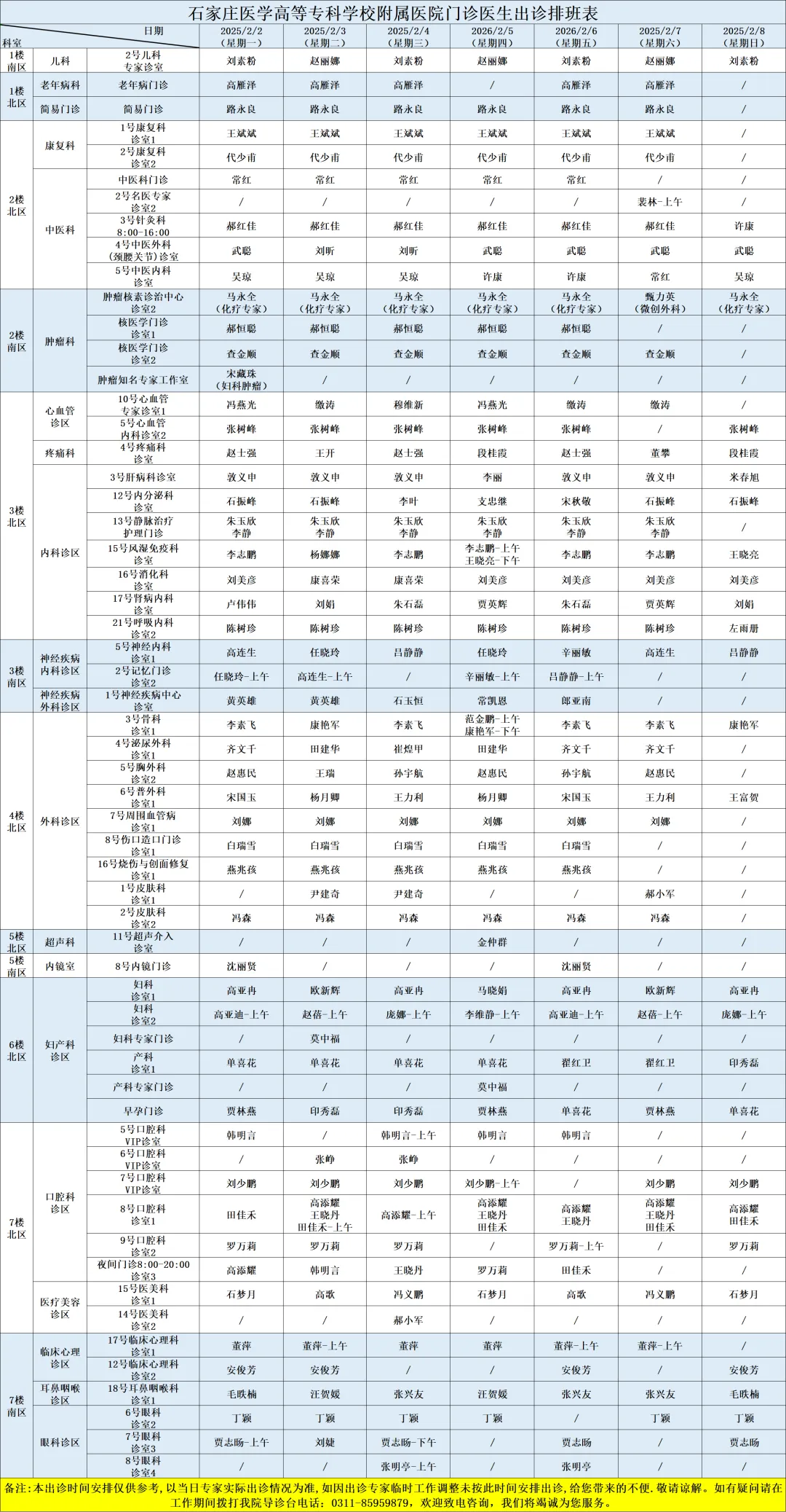 医院开设预防保健科、内科、外科、妇产科、儿科、眼科、耳鼻喉科、口腔科、皮肤科、医疗美容科、肿瘤科、急诊科、重症医学科、康复科、麻醉科、医学检验科、病理科、医学影像科、中医科等50余个一、二级临床、医技科室,能够完成疑难、危重患者的多学科综合治疗。