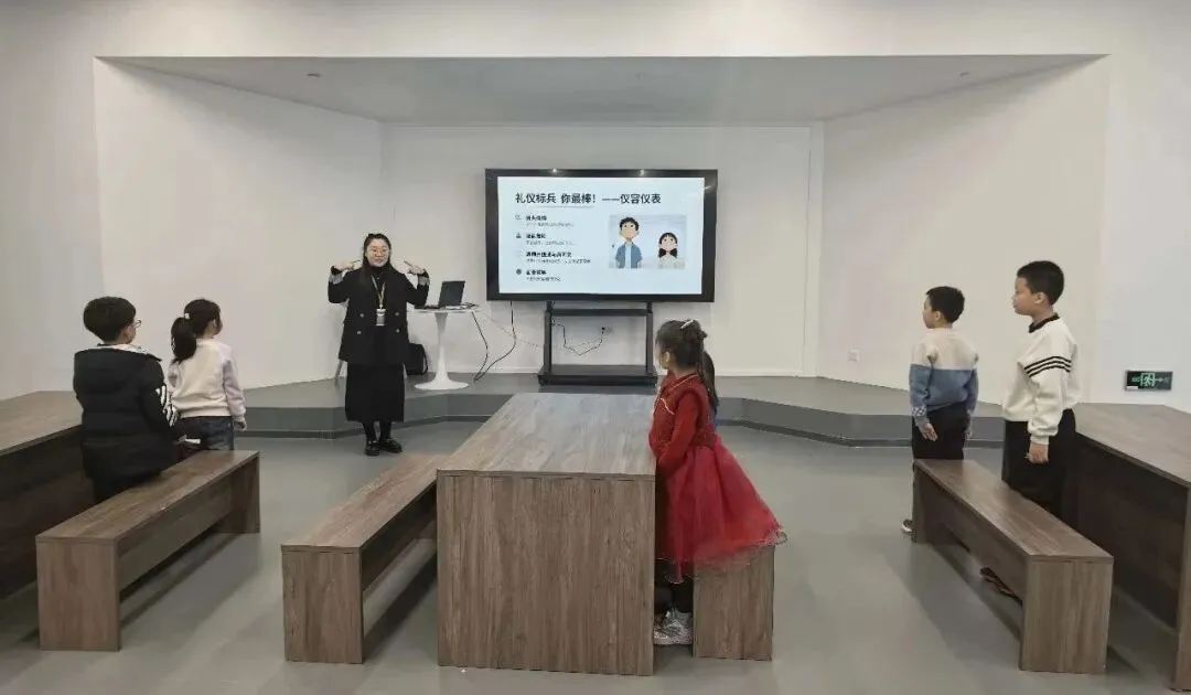 培训现场,美术馆指导老师强调“站姿是讲解员的第一张名片”,通过标准示范、逐人纠正的方式,指导学员掌握双脚与肩同宽、脊柱挺直、微笑平视的规范姿态,克服弯腰、含胸等问题,筑牢专业形象根基。发音与表达课程中,老师指导气息控制,选取融入展览作品讲解内容的文段作为练习素材,让学员在朗诵中把握语调起伏与情感传递,学会用童声讲述作品背后的文化故事。