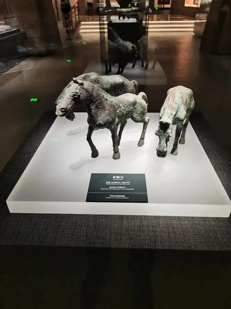 第二站:青铜马,比马踏飞燕还早400年。三匹青铜马歪头、甩尾、啃草,它们可是赵武灵王“胡服骑射”的“教练马”。