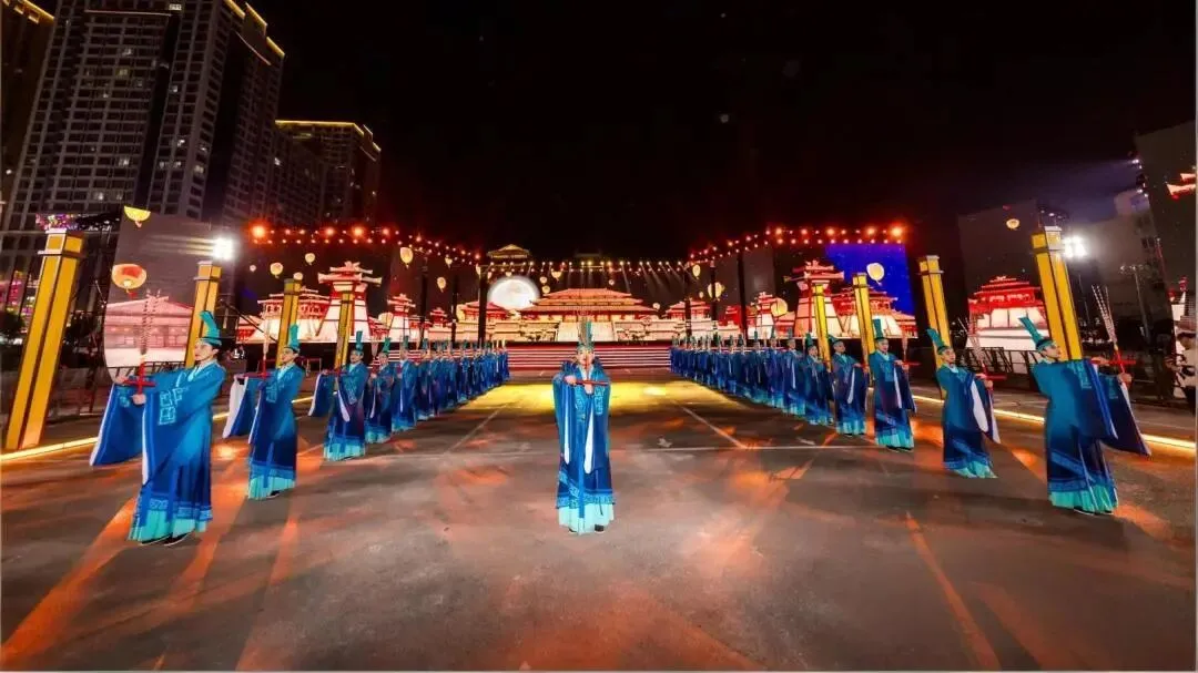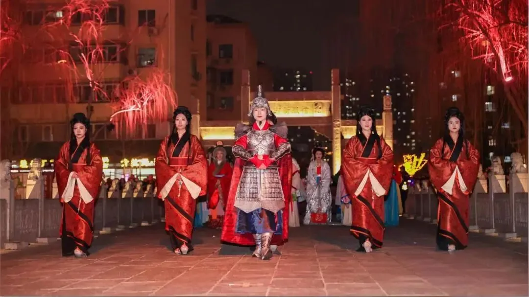 街区全天安排丰富的演艺活动。从学步桥上展现华服之美的《绮梦华裳》表演,到黄金廊前的非遗杂技,再到流动的战国风歌舞巡游互动,让人仿佛置身于千年前的赵都。