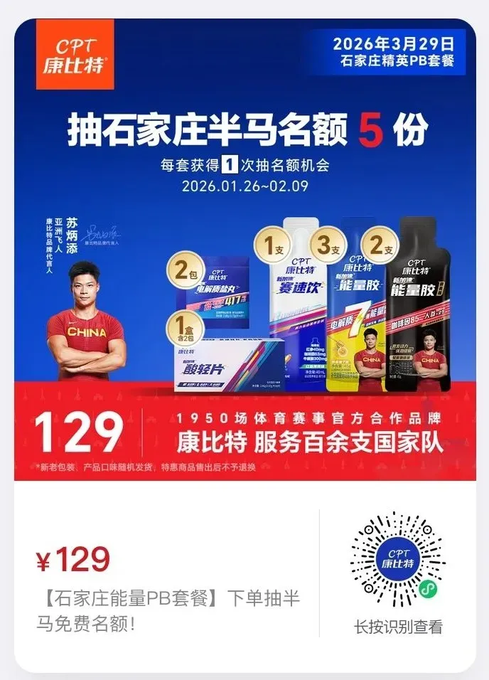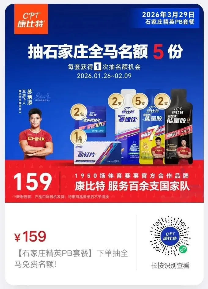 【下单抽名额】活动明细如下,具体见详情页🎁下单享双重专属权益1️⃣下单抽赛事免费名额!【石家庄能量PB套餐】下单抽半马免费名额共计5份!129元/套,每套获得1次抽名额机会,每人最高5次机会。【石家庄精英PB套餐】下单抽全马免费名额共计5份!159元/套,每套获得1次抽名额机会,每人最高5次机会。2️⃣现场领好礼: 凭活动订单截图至石家庄马拉松赛马博会康比特展位,即可免费领取康比特盐丸*1份。河北石家庄,作为河北省省会,是京津冀地区重要的中心城市之一,素有“南北通衢、燕晋咽喉”之称,从石家庄从出发,高铁1小时可达北京、郑州,1小时20分可达太原,1小时30分可达天津,1小时40分可达济南,交通十分便利。河北石家庄马拉松,创办于2009年,目前已是世界田联标牌赛事,比赛线路穿越石家庄六大城区+景点免费游+完赛前100有奖金+正宗牛肉板面免费吃,河北石家庄马拉松正吸引着越多越多跑友参赛。