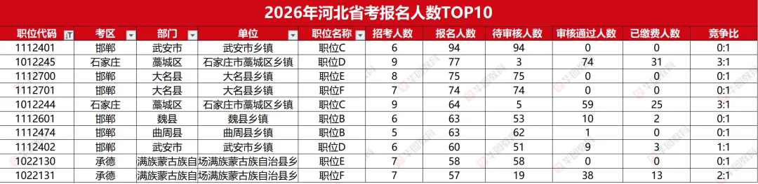 每年竞争前十岗位都是一大看点,截止至18点,竞争比最高的岗位是唐山市丰南区人力资源和社会保障局,职位代码是1051210,不限专业要求,能吸引众多考生报考是有一定原因的。同样,能吸引大家报考,竞争比也是颇高的。