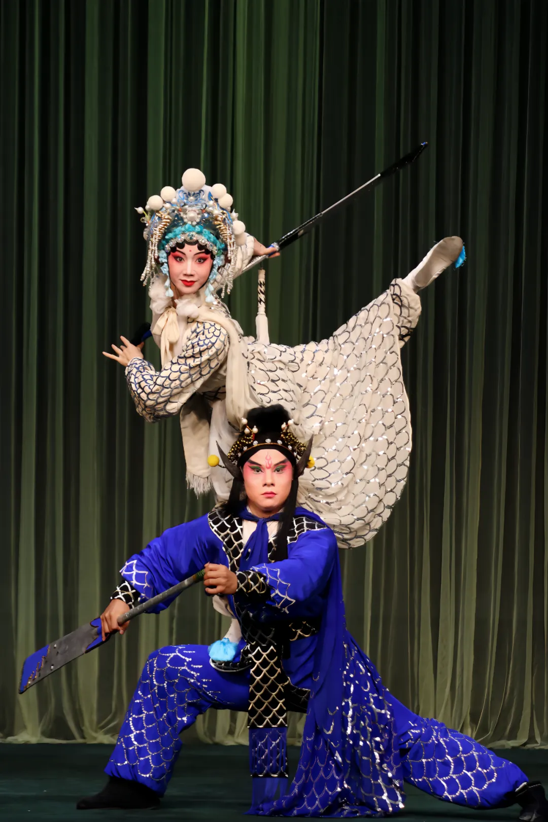 川剧《白蛇传》是一出文武兼备的传统戏曲。白素贞的人物形象前文后武,文白蛇演绎了白素贞的灵动典雅;武白蛇展现了白素贞的飒爽英姿。青儿以男女两个不同的形象轮流串演,也是该剧的一大特色,男青儿以武生应工忠勇刚毅,女青儿以花旦应工俏皮可爱。