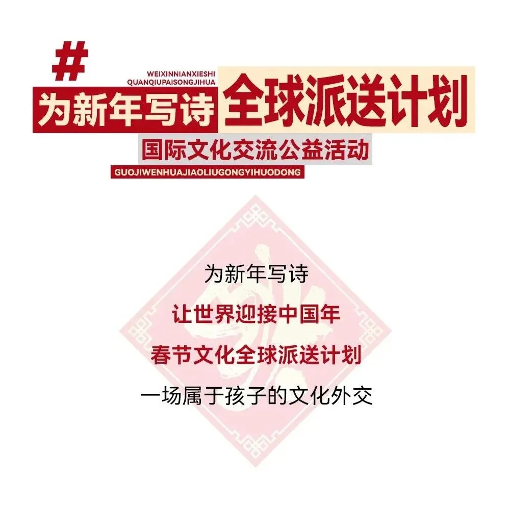我们将在往年“为新年写诗”的基础上,启动“春节文化全球派送计划”:征集10000张由小朋友书写的新春“福”字、春联及创作的门神、灯笼等春节年俗作品,打包成中国文化礼包寄往全球,让海外儿童感受中国春节氛围。