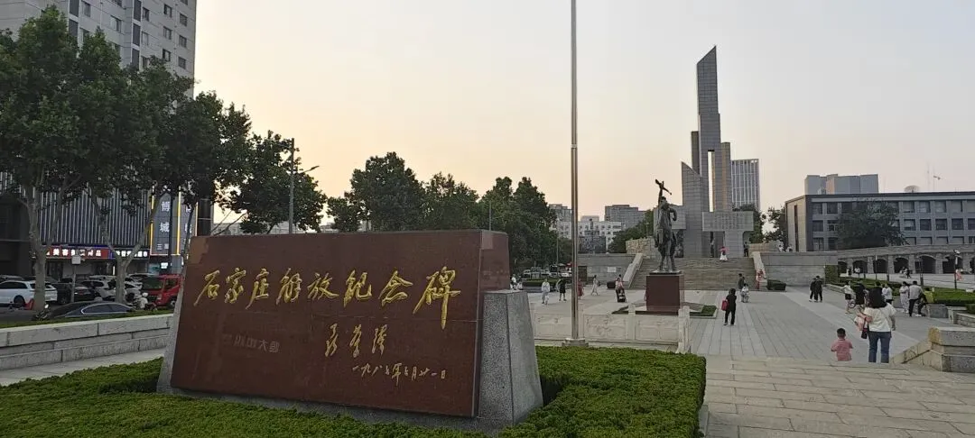 石家庄解放纪念碑解放纪念碑位于石家庄市解放广场北侧,1987年11月12日为纪念石家庄解放40周年建成。主体由碑文台、解放者雕像和主碑组成,碑文台刻有聂荣臻题写的碑名。主碑高33米,由七块高低错落的石板构成,设计刚劲雄伟、挺拔耸立,寓示着在中国共产党领导下,人民解放军经过浴血奋战,一举攻克华北重镇石家庄的丰功伟绩、昂首阔步进行现代化建设的英雄气概。解放者雕塑高7.5米,塑造解放军战士骑马擎枪形象。