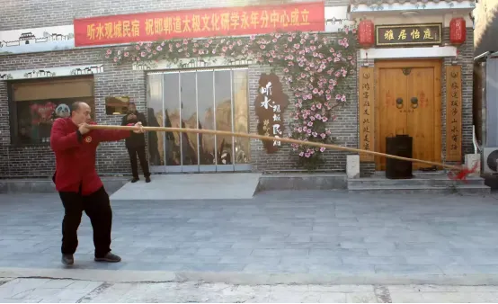 杨志英说:“我虽然致欢迎词,但实际上要说的更多是感谢!感谢各位领导在百忙中抽出时间,来参加邯郸太极文化研学永年分中心的成立仪式;感谢亲临现场的太极拳界同道们牺牲了元旦假期的休息时间出席我们的活动;感谢认识和不认识的朋友们,驻足观看我们的活动”。“接下来,我还要感谢一位特殊的人物,这就是听水观城老板张耀敏女士。九十八年前,也就是1928年,永年武术史上成立了第一个由政府倡议成立的组织——永年县国术馆。虽然是国术馆,但主要教授太极拳。这所国术馆的活动经费,主要来源由一所酱园提供,这所酱园叫太极酱园。该酱园收入除日常开销以外,剩余部分全部贴补给永年国术馆。由此,太极酱园在永年太极拳发展史上留下了光辉的一页。这所太极酱园是在1928年春节期间成立的。九十八年后的今天,恰逢元旦,听水观城民宿又为我们太极文化研学中心提供一个平台,在这里开展工作,主导区域太极文化传承发展。我想,听水观城民宿一定也会像太极酱园一样,在永年太极拳发展史上留下浓墨重彩的一笔”。“来,让我们认识一下听水观城的老板张耀敏女士”。现场掌声雷动,送去感恩之情……