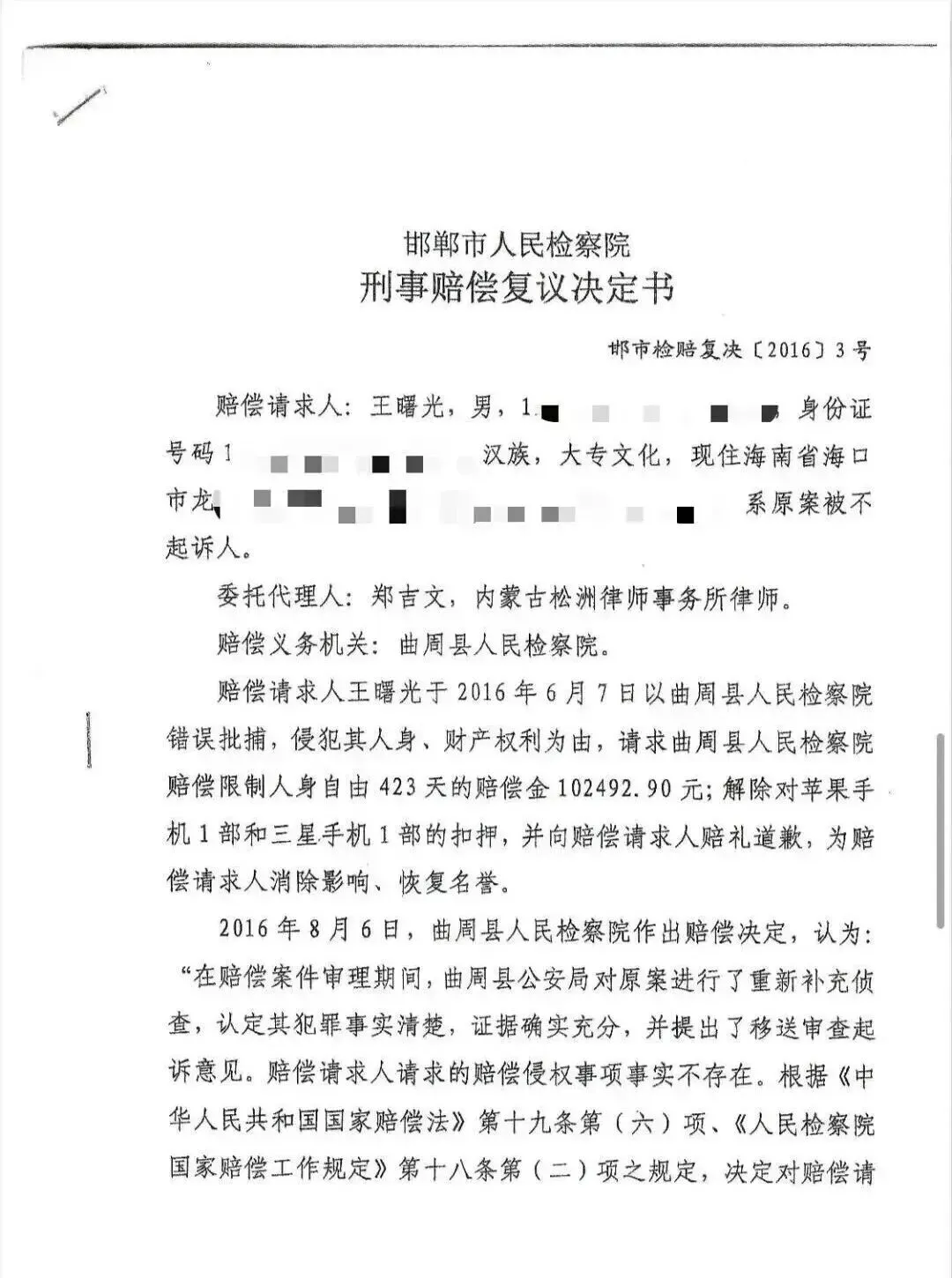 我不服曲周县检察院作出的不予赔偿决定,2016年8月16日,我委托代理律师郑吉文律师向邯郸市人民检察院提出刑事赔偿复议申请。2016年10月11日,邯郸市检察院认为:“赔偿请求人王曙光经曲周县人民检察院批准逮捕,被邱县人民检察院以事实不清、证据不足作出不起诉决定,根据《中华人民共和国国家赔偿法》第十七条、第二十一条第三款之规定,其有取得国家赔偿的权利,曲周县人民检察院应为赔偿义务机关,被羁押时间为424天。曲周县人民检察院以该案因曲周县公安局进行重新补充侦查,并提出了移送审查起诉意见为由,对赔偿请求人王曙光的赔偿请求不予赔偿的决定不符合法律相关规定。”邯郸市检察院作出邯市检赔复决[2016]3号刑事赔偿复议决定,依法支持王曙光的刑事赔偿请求,赔偿人身自由赔偿金102735.2元,精神损失抚慰金11700元,并为王曙光消除影响、恢复名誉、赔礼道歉。(见邯郸检察院刑事赔偿复议决定书)
