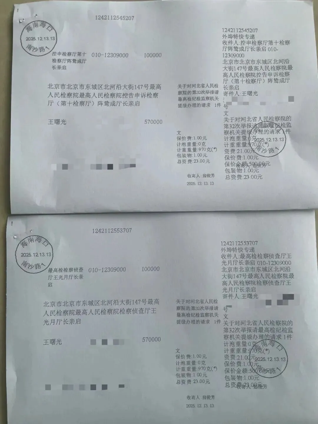 2025年10月7日、10月12日向最高人民检察院应勇检察长、最高检控告申诉检察厅陈鸷成厅长反映,提出刑事申诉至今仍未收到河北省人民检察院正式受案法律文书通知书。 2025年10月16日010-12309最高检回复说已转河北省人民检察院。