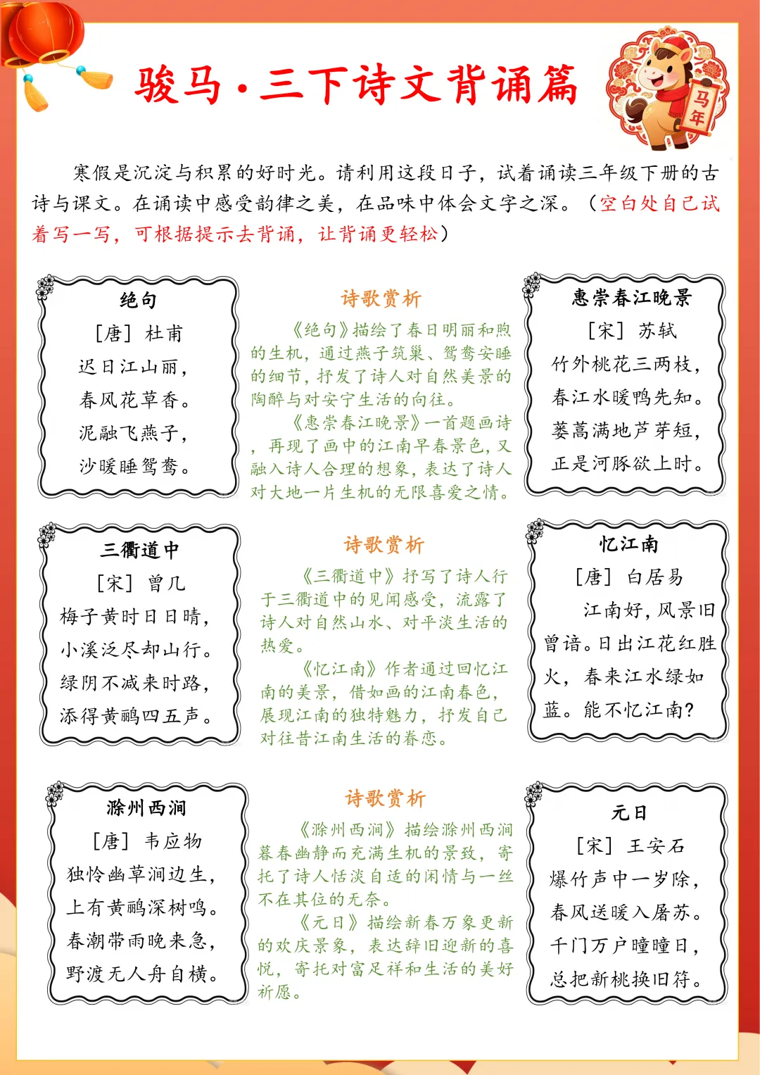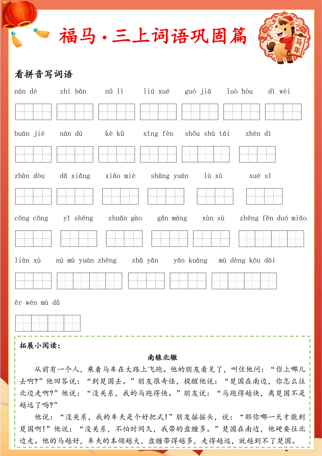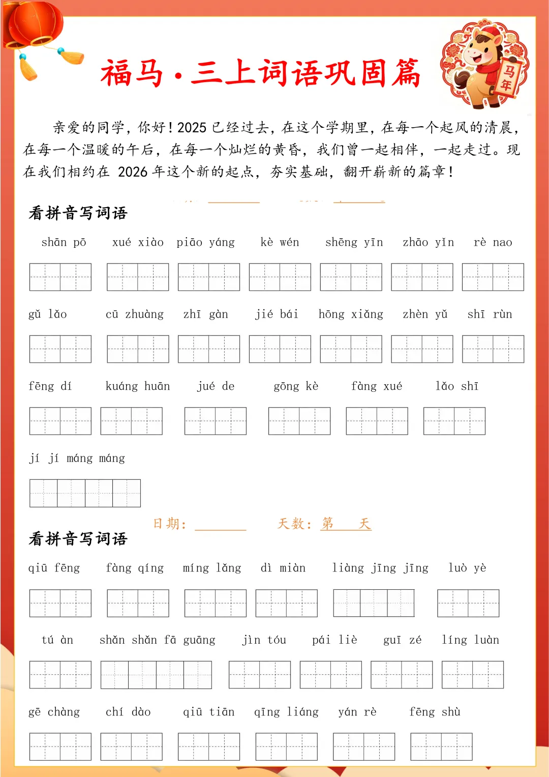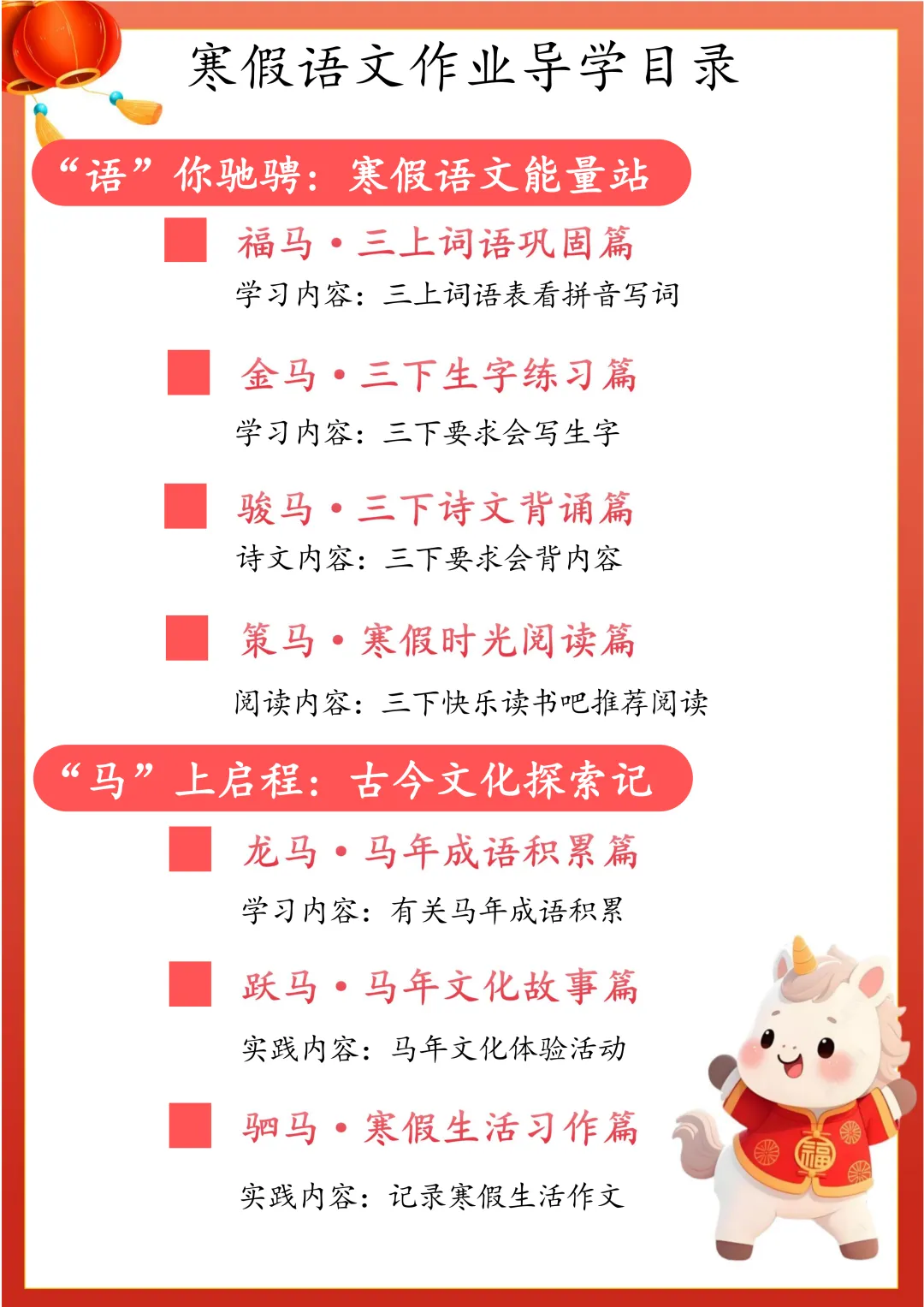 时序更替,寒假启幕。2026马年新春将至,邯郸市张建敏小学语文名师工作室紧扣三年级学段特点,以“骐骥驰骋 乐享寒假”为主题,精心设计融合基础巩固、文化传承与生活实践的寒假语文作业,让孩子们在笔墨书香与年俗雅趣中,度过一个有温度、有深度的假期。