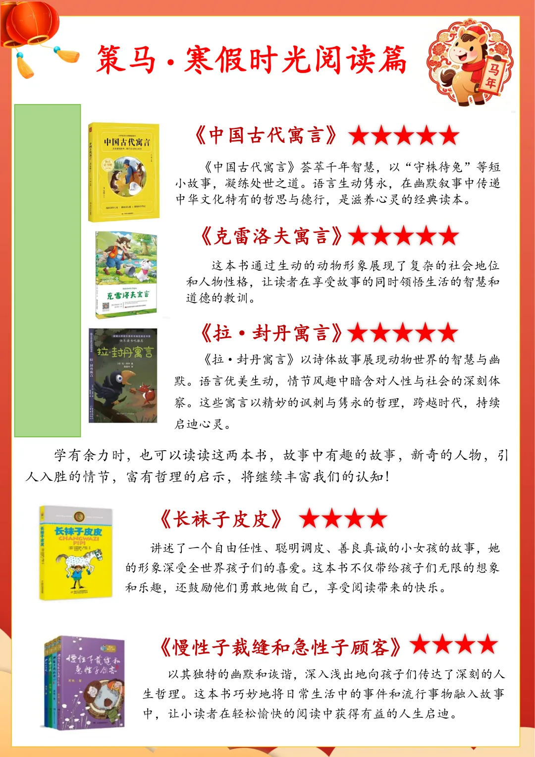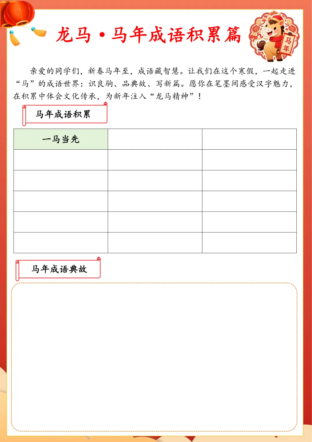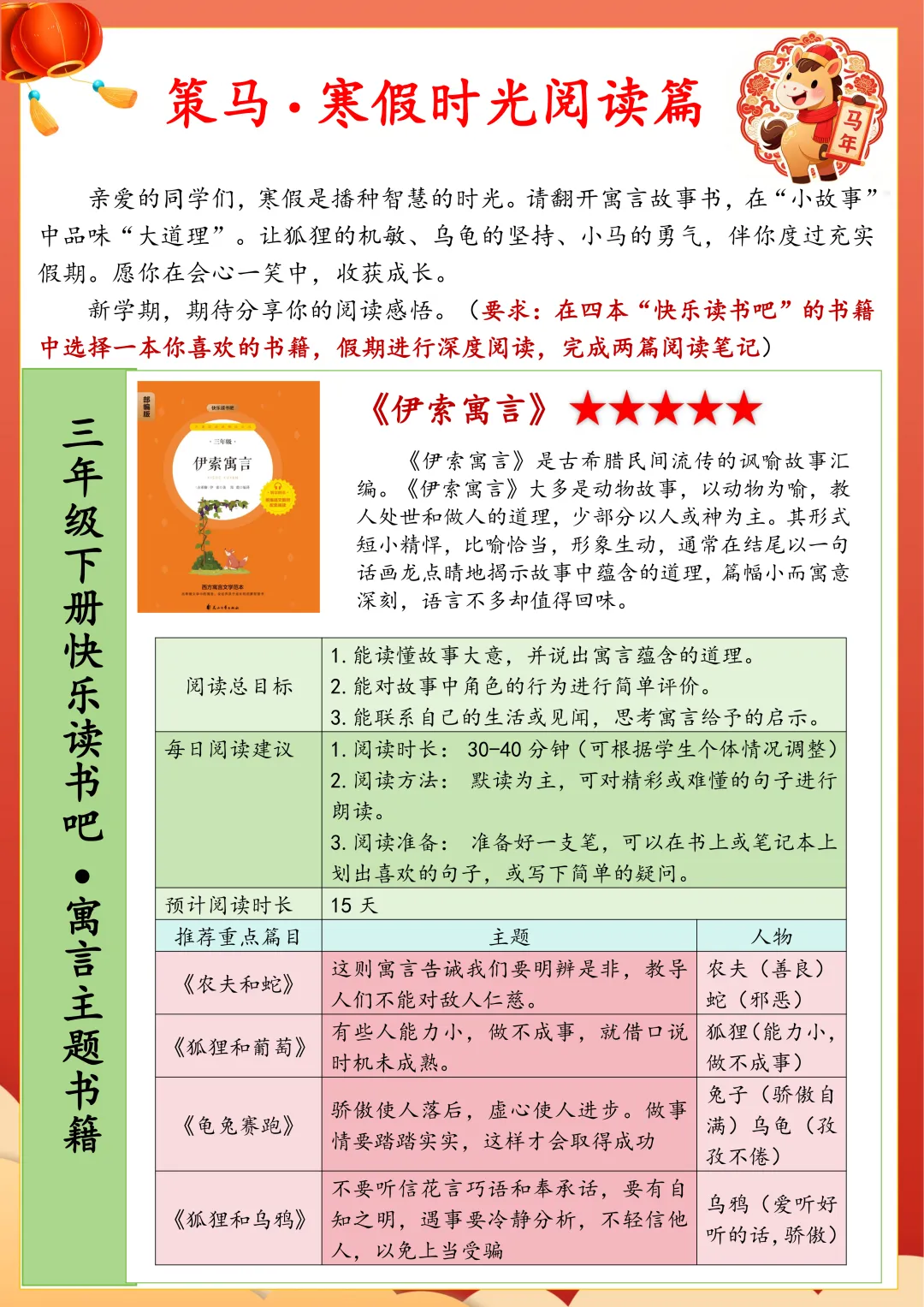 本次寒假作业以“马年文化”为核心线索,构建“语”你驰骋、“马”上启程两大板块,内容丰富且层层递进。“语”你驰骋板块聚焦知识夯实,包含“福马·三上词语巩固篇”,通过看拼音写词语等形式筑牢字词基础;“金马·三下生字练习篇”提前预习下册生字,在横竖撇捺间感受汉字之美;“骏马·三下诗文背诵篇”精选《绝句》《守株待兔》等经典诗文,搭配赏析与背诵指导,助力文化积累;“策马·寒假时光阅读篇”推荐《伊索寓言》《中国古代寓言》等书目,辅以阅读笔记,培养深度阅读习惯。“马”上启程板块侧重文化探索与实践表达,“龙马·马年成语积累篇”引导学生收集马年成语、探寻典故;“跃马·马年文化故事篇”通过汉字寻根、诗意创作、民俗访谈、邮票设计等趣味任务,深挖马文化内涵;“驷马·寒假生活习作篇”以“我学会了……”为题,鼓励学生记录假期成长,将积累转化为表达能力。此外,作业开篇的温情信笺的设计,更让学习充满仪式感与人文关怀。