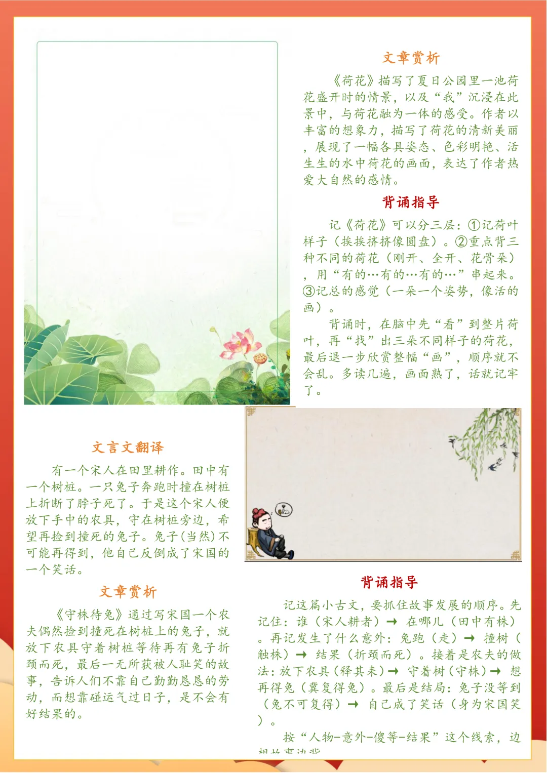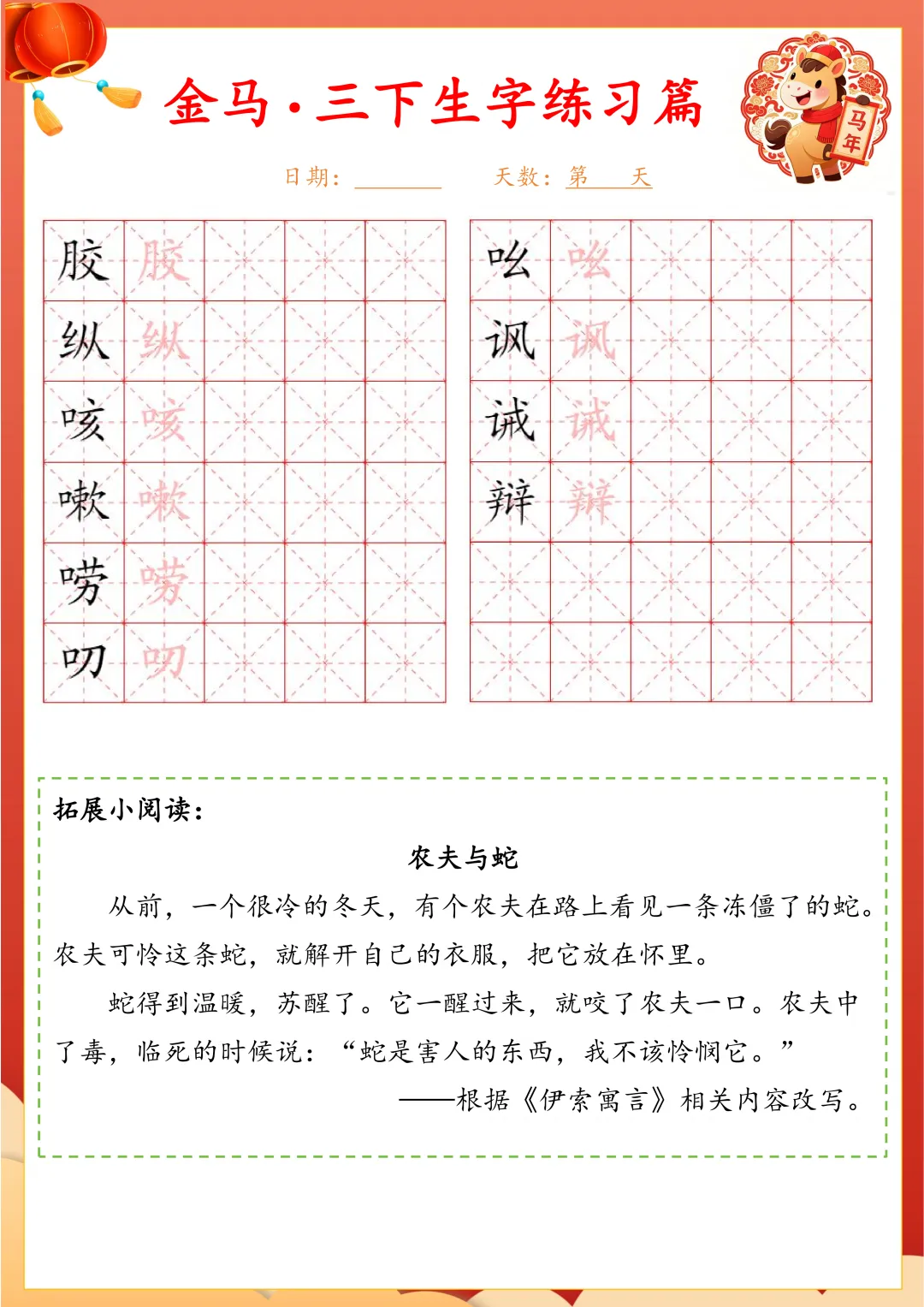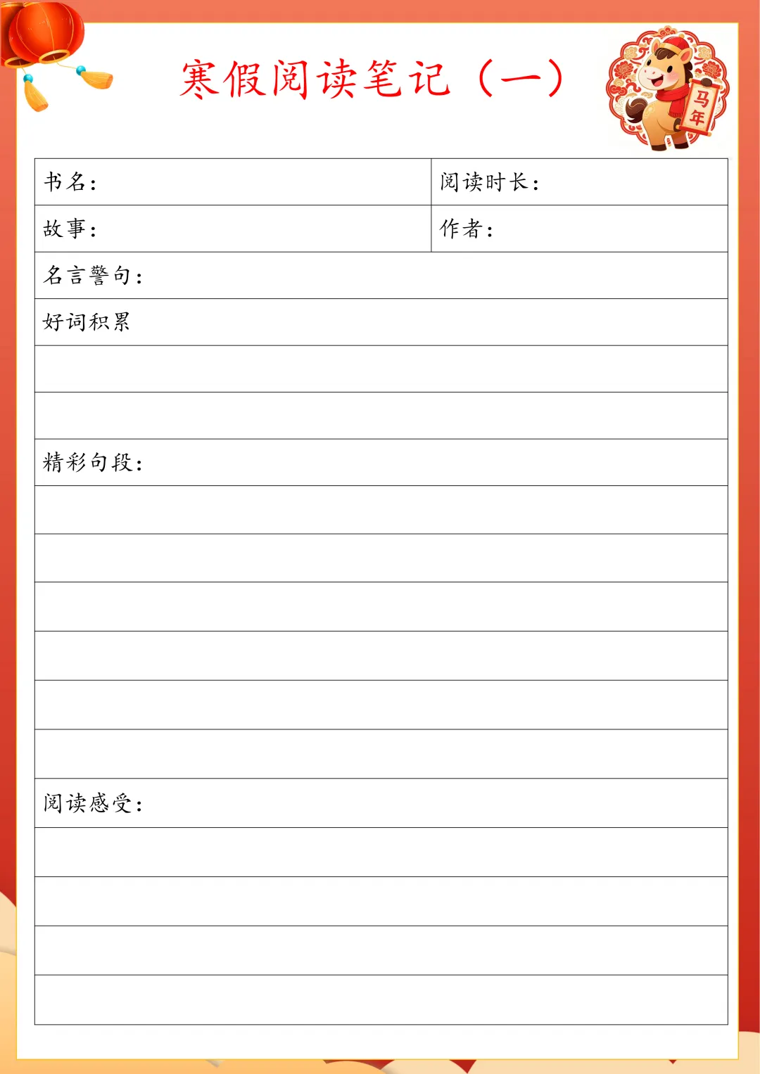 本次寒假作业以“马年文化”为核心线索,构建“语”你驰骋、“马”上启程两大板块,内容丰富且层层递进。“语”你驰骋板块聚焦知识夯实,包含“福马·三上词语巩固篇”,通过看拼音写词语等形式筑牢字词基础;“金马·三下生字练习篇”提前预习下册生字,在横竖撇捺间感受汉字之美;“骏马·三下诗文背诵篇”精选《绝句》《守株待兔》等经典诗文,搭配赏析与背诵指导,助力文化积累;“策马·寒假时光阅读篇”推荐《伊索寓言》《中国古代寓言》等书目,辅以阅读笔记,培养深度阅读习惯。“马”上启程板块侧重文化探索与实践表达,“龙马·马年成语积累篇”引导学生收集马年成语、探寻典故;“跃马·马年文化故事篇”通过汉字寻根、诗意创作、民俗访谈、邮票设计等趣味任务,深挖马文化内涵;“驷马·寒假生活习作篇”以“我学会了……”为题,鼓励学生记录假期成长,将积累转化为表达能力。此外,作业开篇的温情信笺的设计,更让学习充满仪式感与人文关怀。