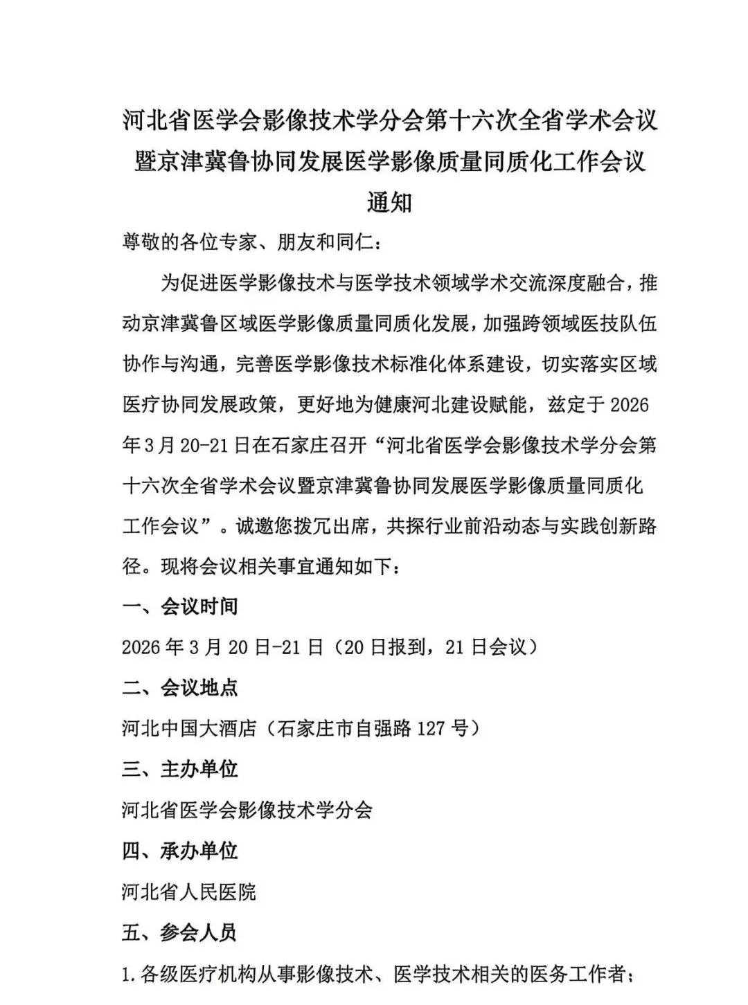 >3/20-21日 石家庄 | 关于召开“河北省医学会影像技术学分会第十六次全省学术会议暨京津冀鲁协同发展医学影像质量同质化工作会议”的通知