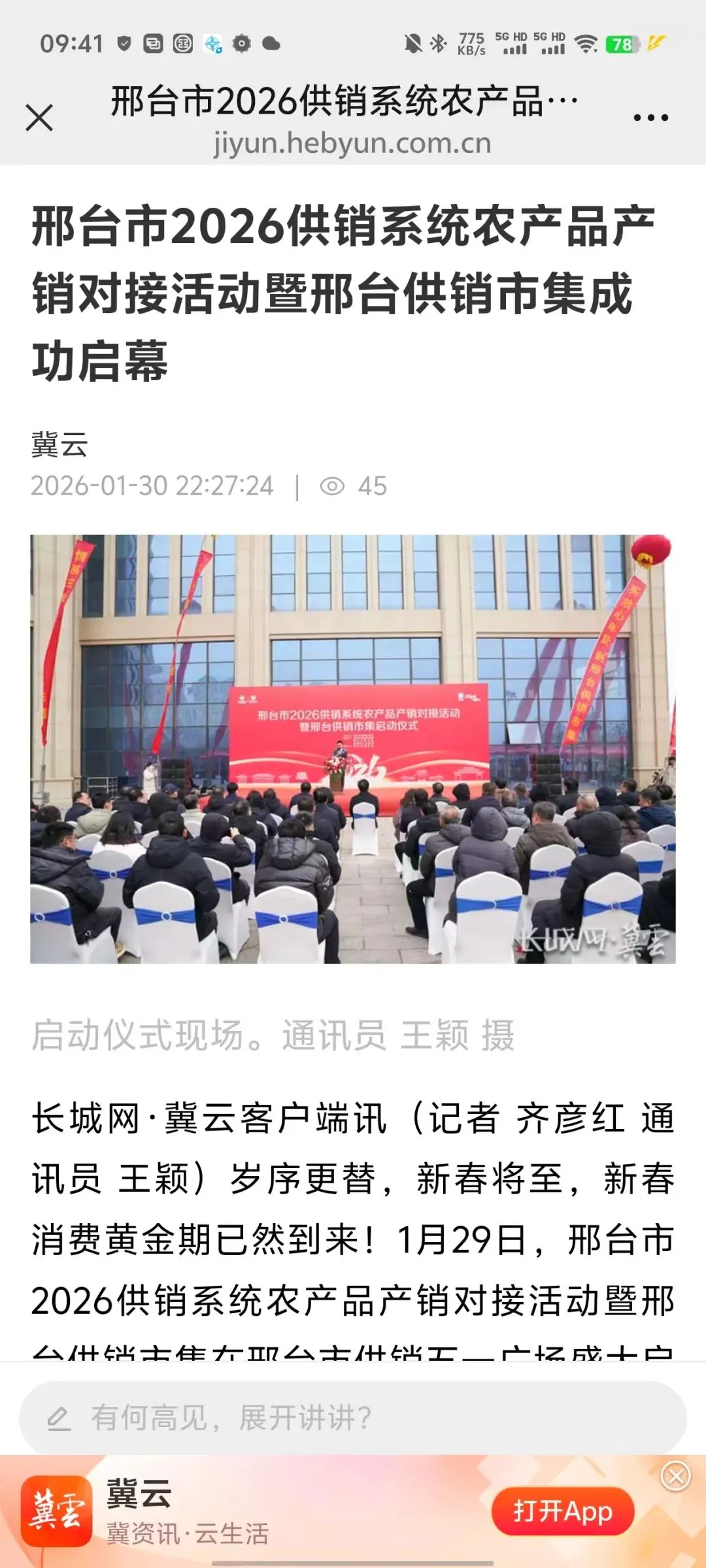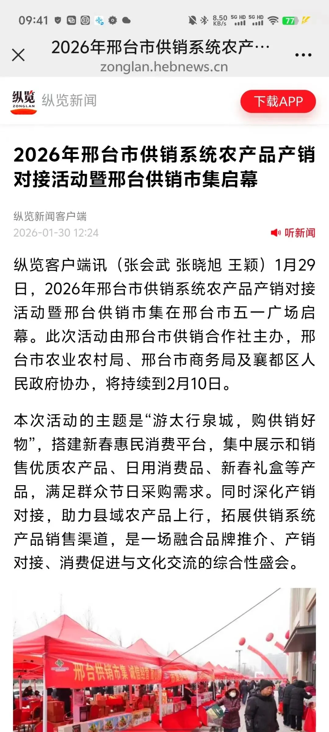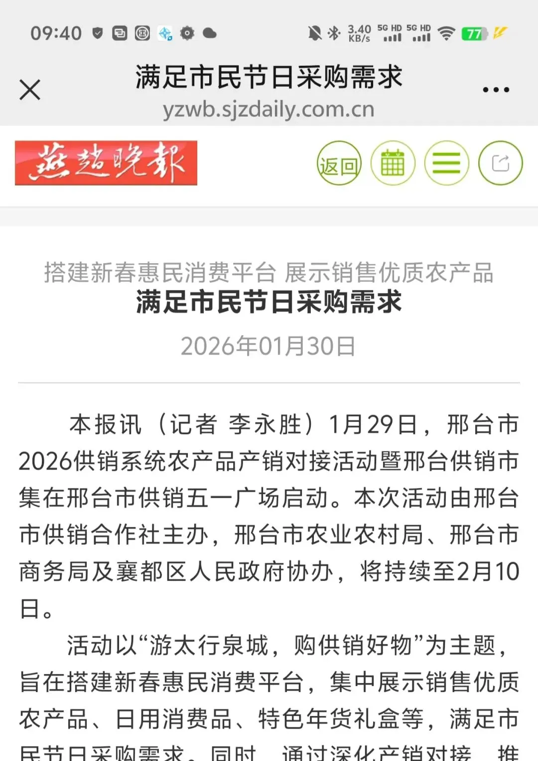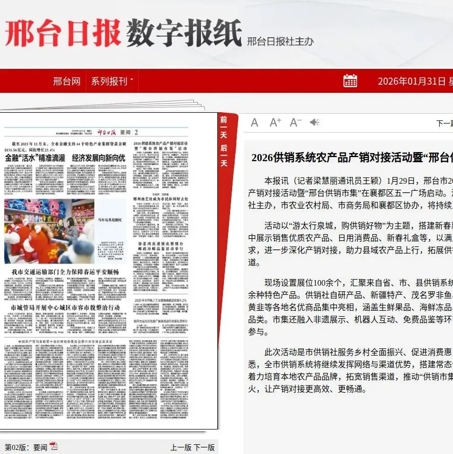 近日,邢台市2026供销系统农产品产销对接活动暨邢台供销市集在邢台市供销五一广场成功举行,被多家媒体广泛报道,反响热烈。燕赵晚报、燕赵都市报、邢台日报等多家省市媒体予以报道,为太行泉城的新春佳节增添了一抹亮色。