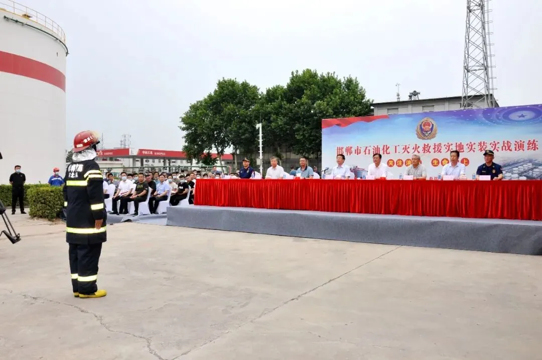 为切实做好庆祝建党百年活动期间的灭火救援工作,进一步提升处置石油化工火灾事故的能力,6月28日下午,邯郸市消防救援支队与邯郸公司联合开展了石油化工灭火救援实地实装实战演练。此次实战演练在邯郸公司中心油库举行,邯郸市市长樊成华以及市政府相关领导同志、全市22个消防大队大队长和50余家石油化工重点单位的负责人共计100余人观摩了此次实战演练。