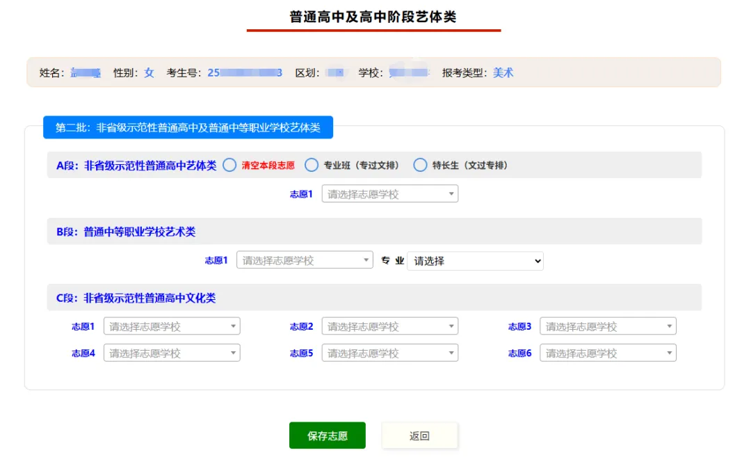 普通高中及高中阶段艺体类第二批次志愿,设置三段志愿填报类型。