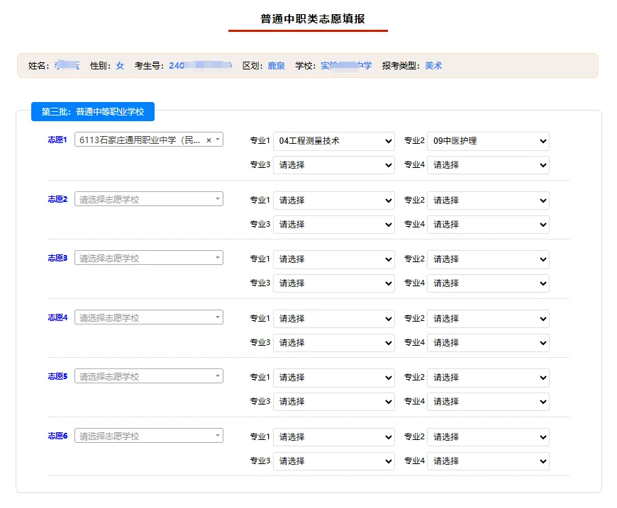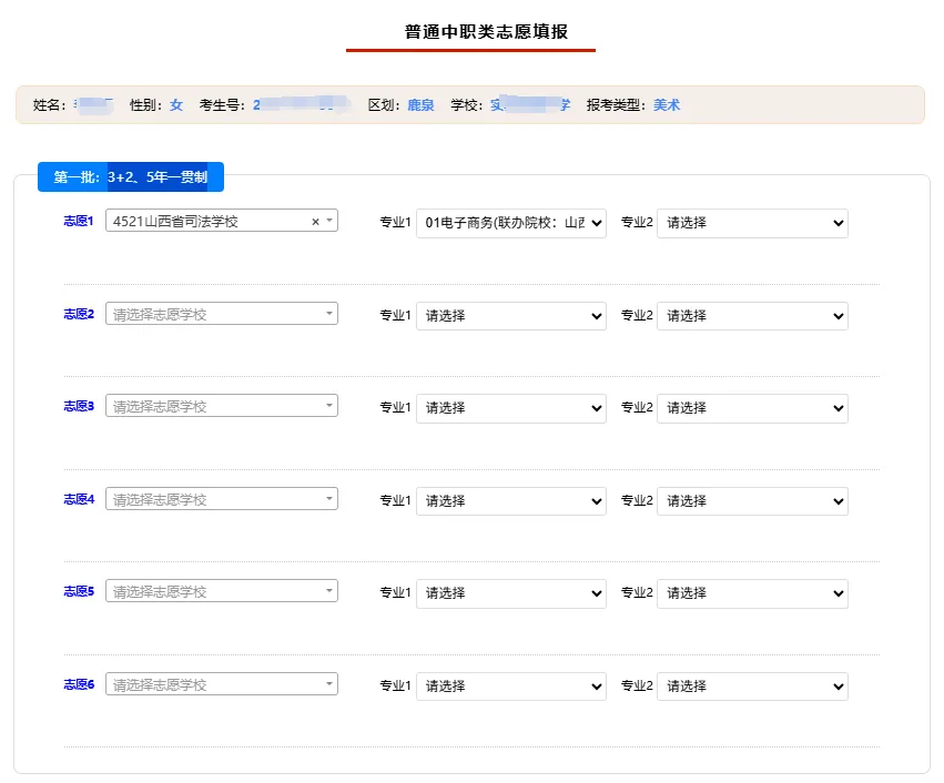 志愿填报分三个批次,分别为提前批类、普通高中及高中阶段艺体类及3+2、五年一贯制和普通中职类。