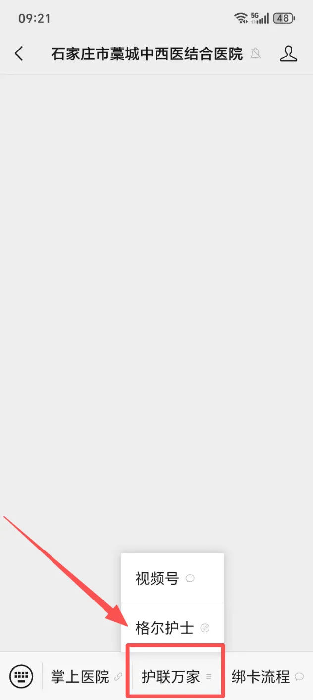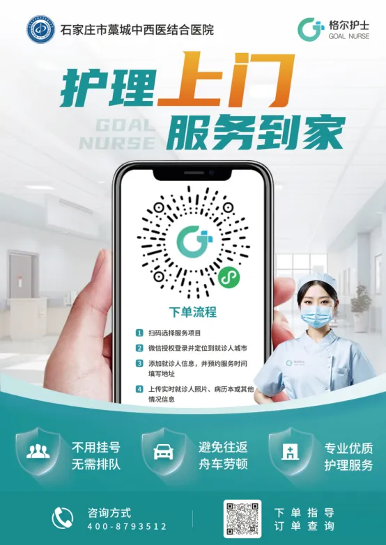 方法1:微信搜索并关注“石家庄市藁城中西医结合医院”公众号→点击“护联万家”中的“格尔护士”。