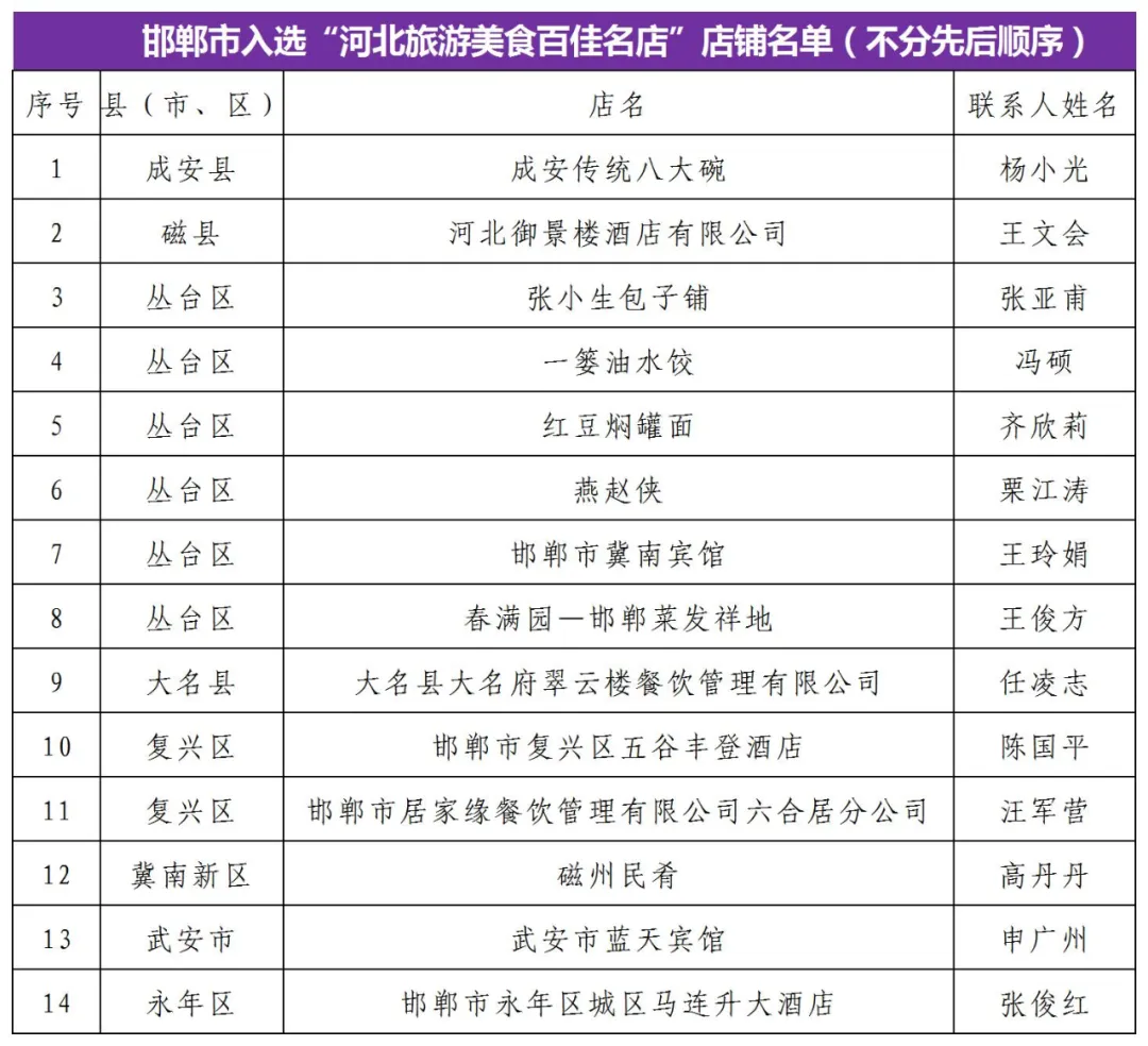 凭借优质的餐饮品质与鲜明的地方特色,邯郸市一篓油水饺、张小生包子铺、磁州民肴、武安市蓝天宾馆、邯郸市永年区城区马连升大酒店、河北御景楼酒店有限公司等14家餐饮单位成功入选河北旅游美食百佳名店。此次活动不仅提升了邯郸特色美食的知名度与影响力,更以美食为媒,进一步打响邯郸文旅品牌,吸引更多游客走进邯郸、了解邯郸。