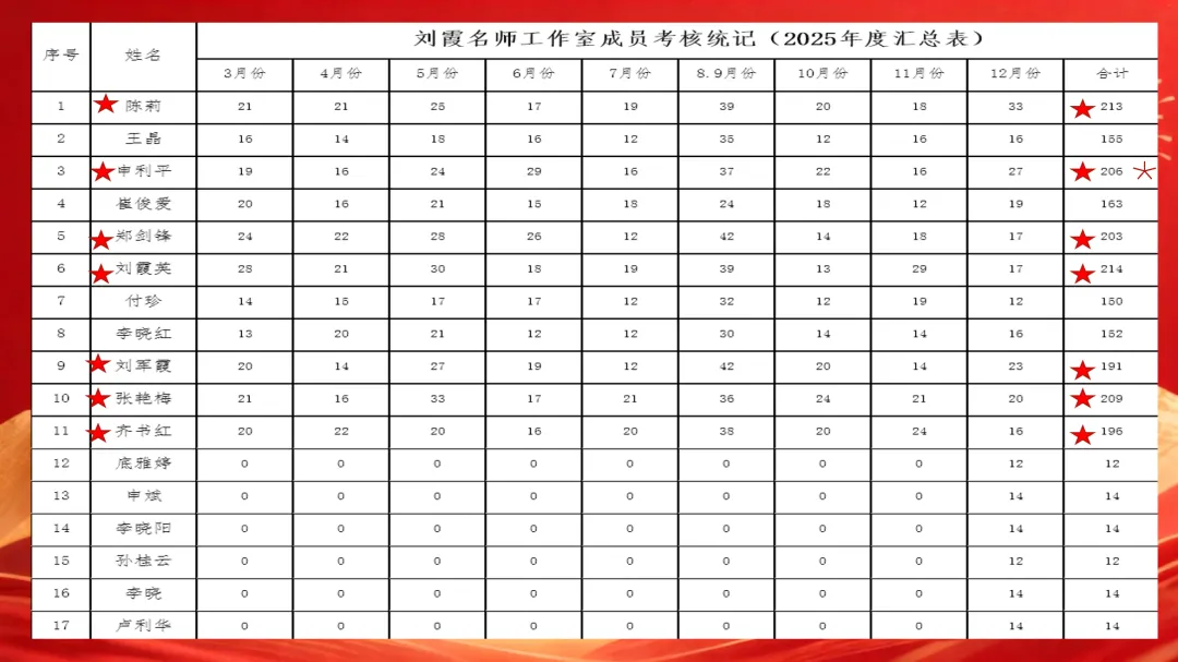 年度耕耘有痕,成长量化有尺。为客观梳理成员年度专业成长轨迹,精准评价工作室实践成效,邯郸市初中英语刘霞名师工作室依据考核细则,对全体成员 2025 年度参与教研活动、深耕教学实践、推进成果落地等各项工作进行量化积分考核。考核积分既是成员一年来笃行深耕、聚力成长的直观体现,更是工作室以评促学、以评促研、以评促优的重要抓手。以下为工作室成员年度考核积分情况公示,以实绩见成长,以量化促前行。