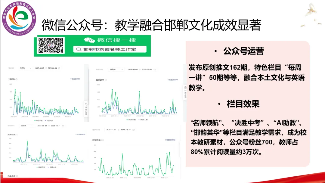 微信公众号作为核心阵地,规范化运营成效突出,累计发布原创推文162期,打造“每周一讲”、“名师领航”等多个特色栏目。其中“每周一讲”推出50期,涵盖邯郸成语、非遗、名胜、美食等本土文化微课,实现文化传播与英语教学深度融合;“决胜中考”“AI助教优课设计”等栏目精准对接教学需求,被多所学校纳入校本教研素材。公众号粉丝达700人,教师群体占比80%,单篇最高阅读量突破600人次,累计点击量突破3万次,辐射范围持续扩大。