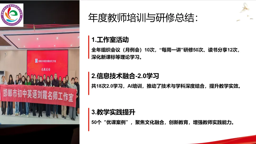2025年开展工作室会议10次、读书活动12次,围绕新课标、核心素养等主题深化理论学习;参与AI赋能培训、四级贯通研讨会等教师科活动,18次信息技术2.0学习推动信息技术与学科深度融合。通过“优课精析坊”5期专题培训,聚焦文化融合、亲情教育等主题开展课例研讨,助力教师提升教学实践能力。