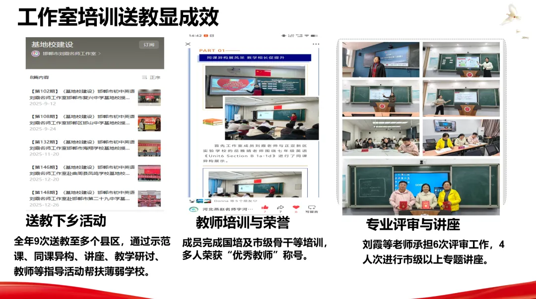 工作室成员积极参与各级培训,2人完成国培计划,1人参加市级骨干教师培训;多人获“优秀教师”“教学能手”等荣誉称号。全年开展送教下乡9次,覆盖魏县、涉县、鸡泽县、曲周县等多个县区,通过示范课与专题讲座精准帮扶薄弱学校。刘霞等老师承担6次各级评审工作,4人次开展市级以上专题讲座,彰显专业引领力。