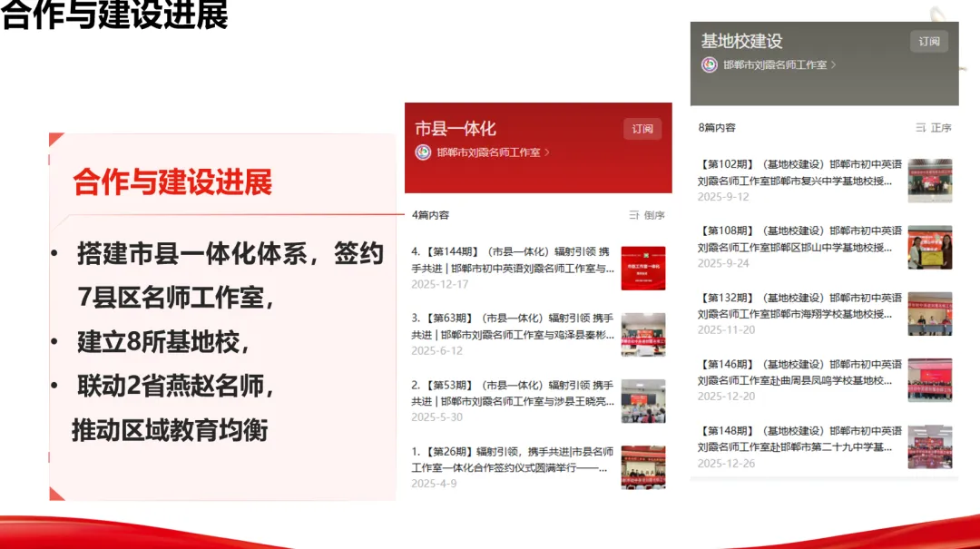 基地校建设:搭建市县一体化合作体系,与7个县区名师工作室签约,建立9所基地校。