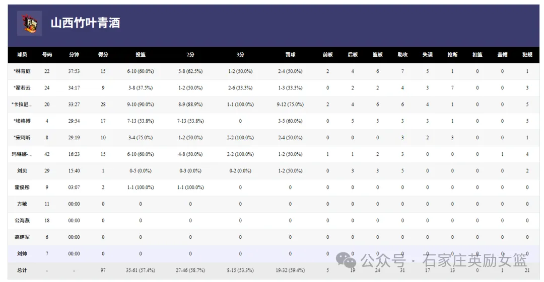 次节,山西队提升了防守强度,让石家庄英励的进攻效率下降。山西队把握机会,快攻反击接连得手,最多时曾领先多达21分。上半场结束时,石家庄英励以37比58落后。