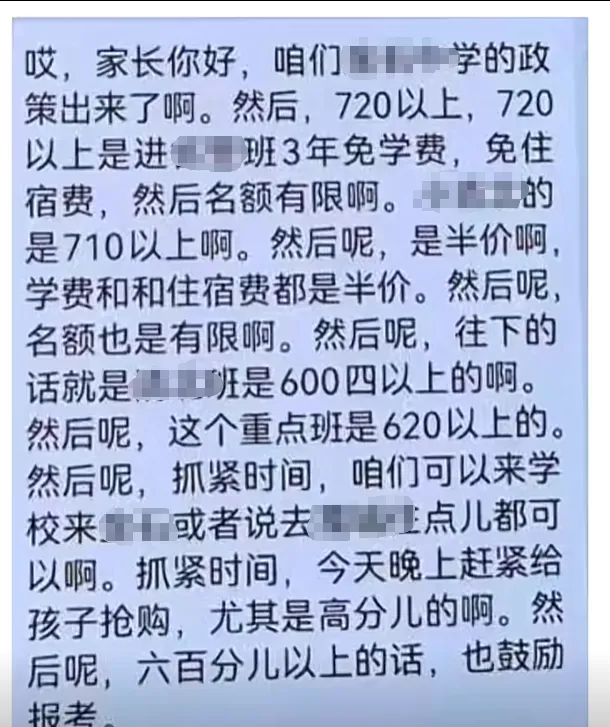 尖子班与普通班收费与资源分配呈现鲜明反差:普通班学生按学校备案的标准缴费学费,尖子班学生按分数梯队减免,甚至为0,有些学校的尖子生不光不交学费,还能获奖学金,三年学杂费加下来,相当于“低成本甚至零成本”就读。