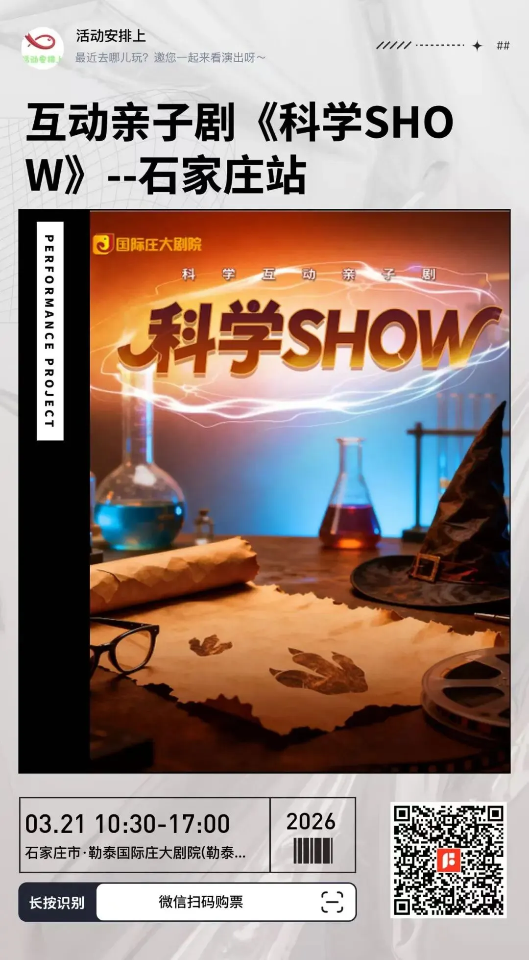 体验式亲子科学剧《科学SHOW》讲述了疯狂怪博士的科研室通过科学实验,穿越到了白垩纪恐龙岛中,博士又将恐龙一起带回了现代,意外再次穿越到了魔法城堡,遇见了女巫,他们将带领着大家走进一个又一个精彩而神秘的科学实验中,爆笑而奇幻!