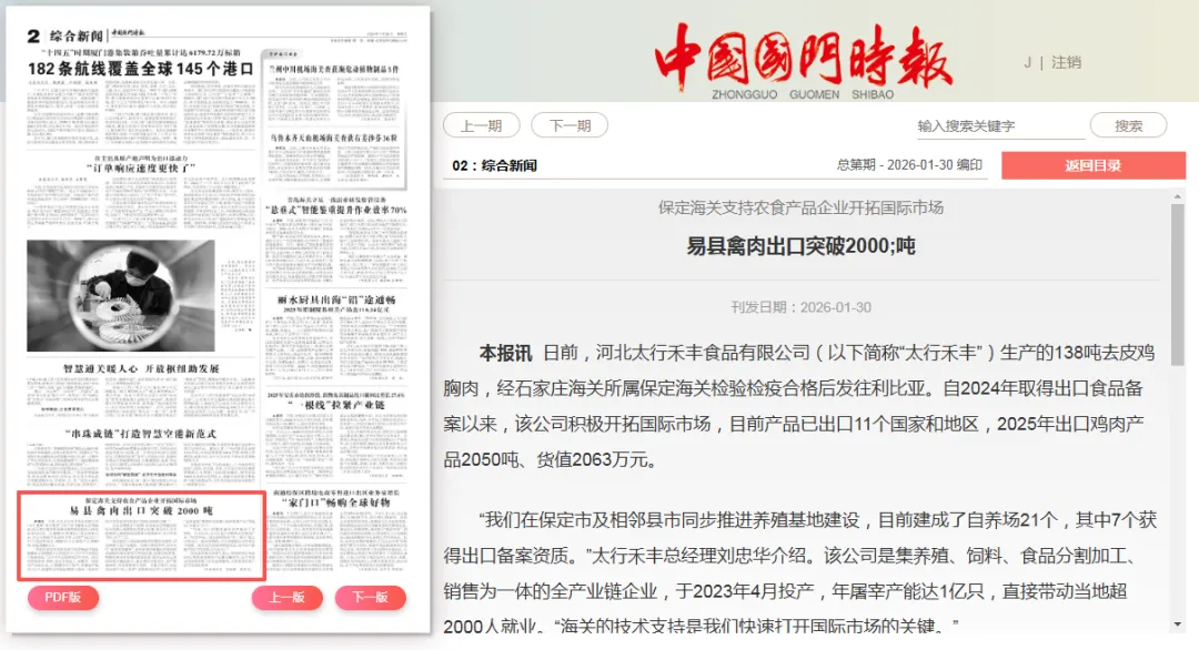 保定海关支持农食产品企业开拓国际市场 易县禽肉出口突破2000;吨