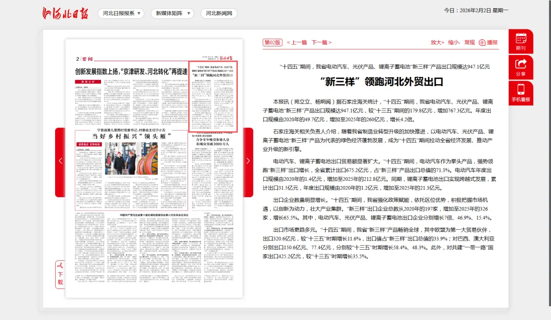“十四五”期间,我省电动汽车、光伏产品、锂离子蓄电池“新三样”产品出口规模达947.1亿元 “新三样”领跑河北外贸出口