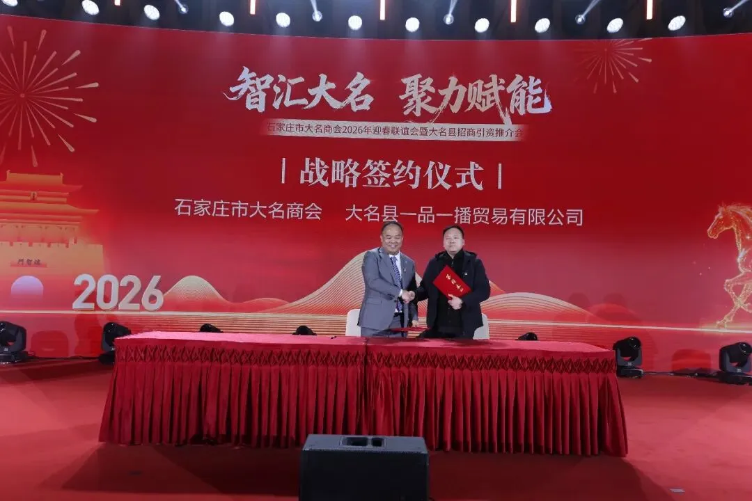 战略签约环节中,石家庄市大名商会分别与大名县一品一播贸易有限公司签订战略合作协议,与天津市大名商会、保定市大名商会签订三方战略合作协议,此次签约将进一步拓宽合作领域、整合优质资源,助力三地商会联动发展,为家乡招商引资、产业升级注入新动能。