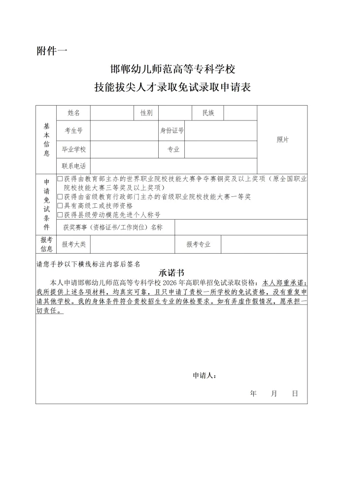 3.邯郸幼儿师范高等专科学校单招免试入学申请表(见附件一)