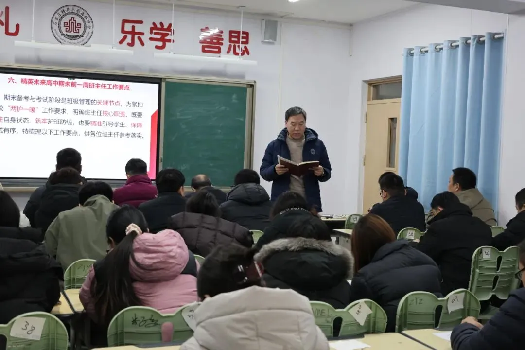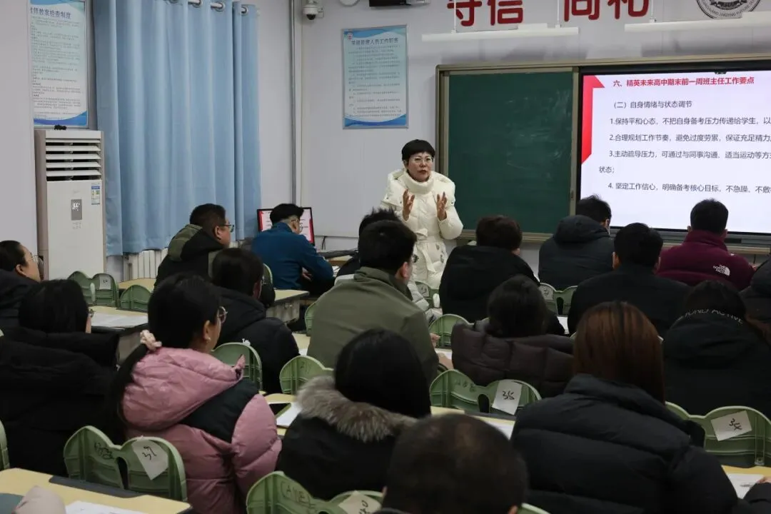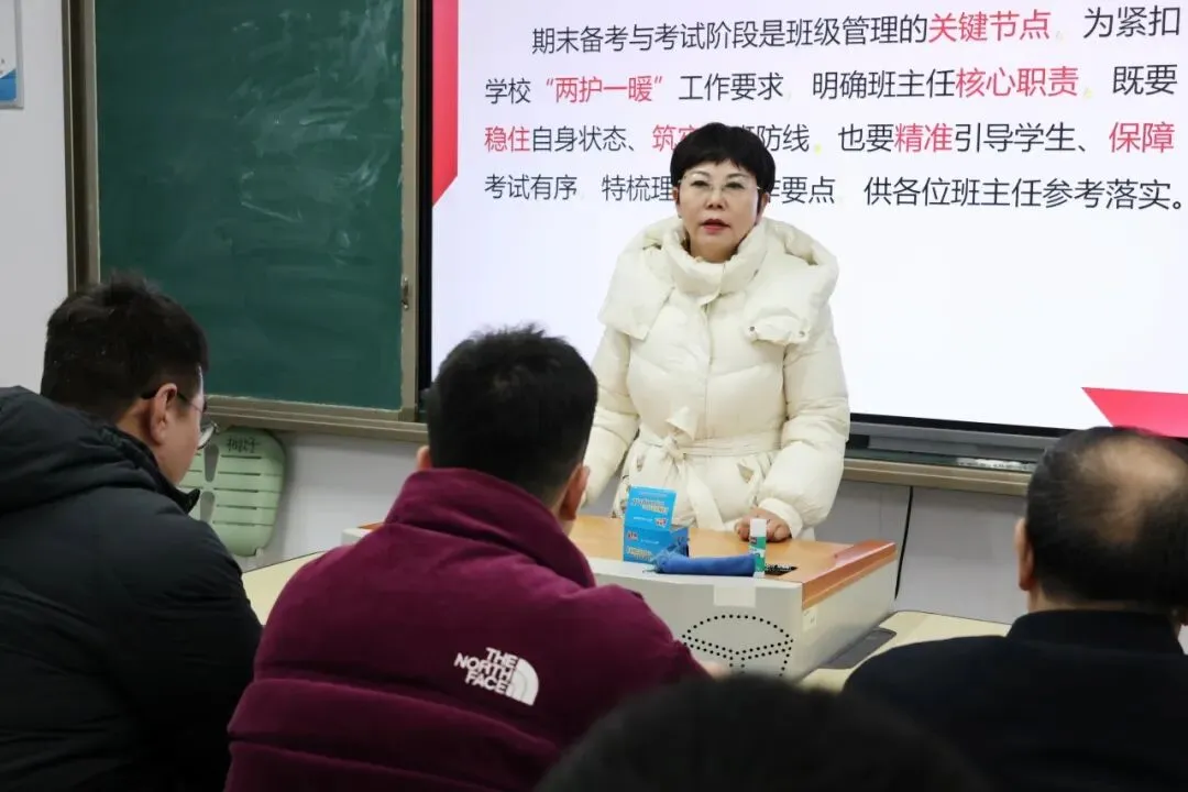 最后,张彩茹校长作总结讲话。她指出,班主任是期末备考的核心力量,要以 “稳状态、保秩序、暖人心” 为核心,自身先做好护班履职,关键时段全程在岗,以平和心态传递正能量。同时要精准关注学生需求,既要严抓纪律,也要用眼神交流、简短问候等细节传递关怀,联动家长为学生减压,做学生最坚实的后盾。