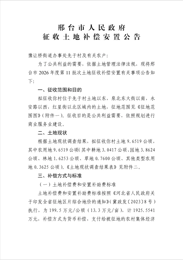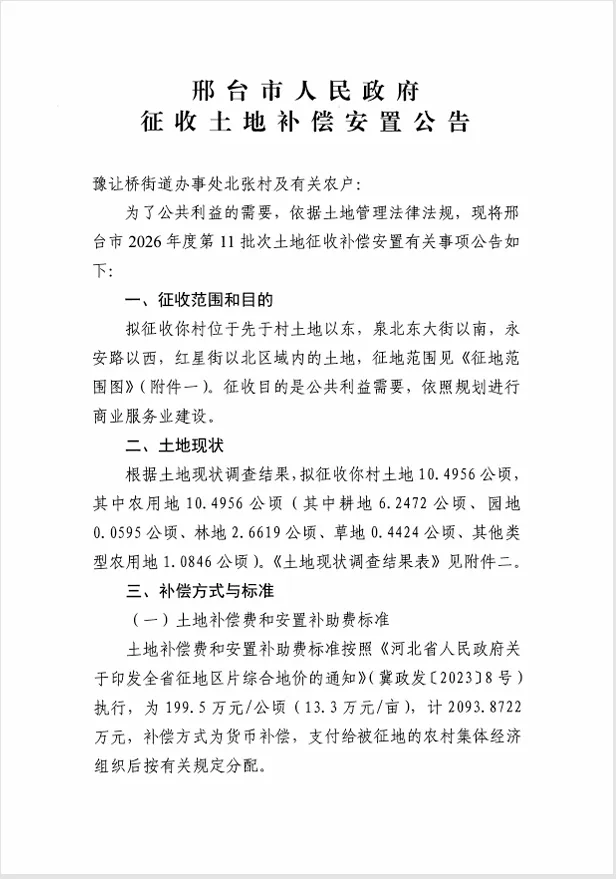 2026年1月26日,邢台市人民政府网发布2026年度第11批次建设用地征收土地补偿安置公告,此次征地涉及豫让桥街道办事处北张村和先于村,征收目的为公共利益需要,将依照规划进行商业服务业建设,相关细节与村民权益密切相关,速看详解!