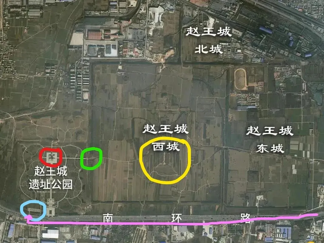 导航要设到邯郸西南角的“赵王城遗址公园南门停车场”。从市中心开车20分钟(10公里)到南环路西转(下图粉色路线),过了马庄立交桥,看到右手残高3至8米蜿蜒起伏的夯土城墙残垣,前走不久路右边(北侧)就看到了公园南大门(下图蓝圈右侧)。