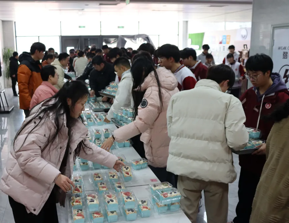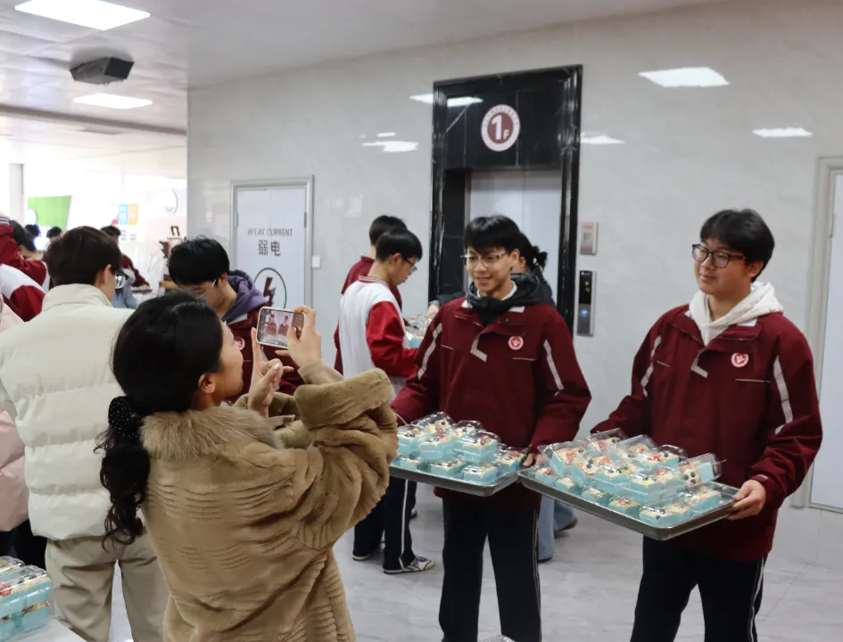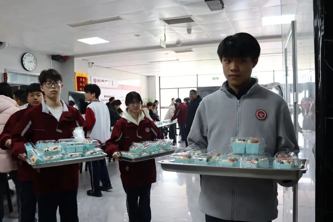 “来,小心拿好。”老师们亲手把蛋糕递到学生手中,指尖的温度伴着蛋糕的甜香,让冬日的大厅格外暖。