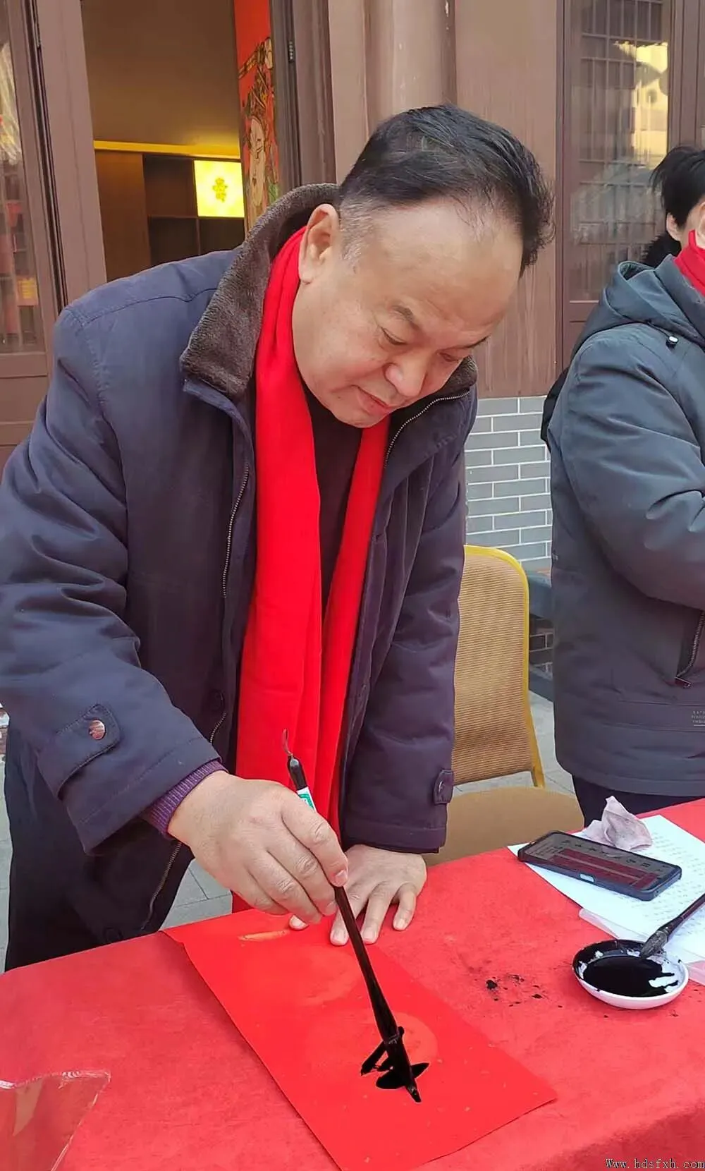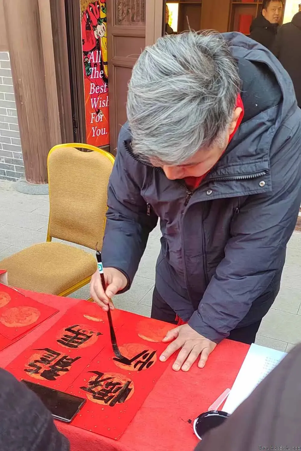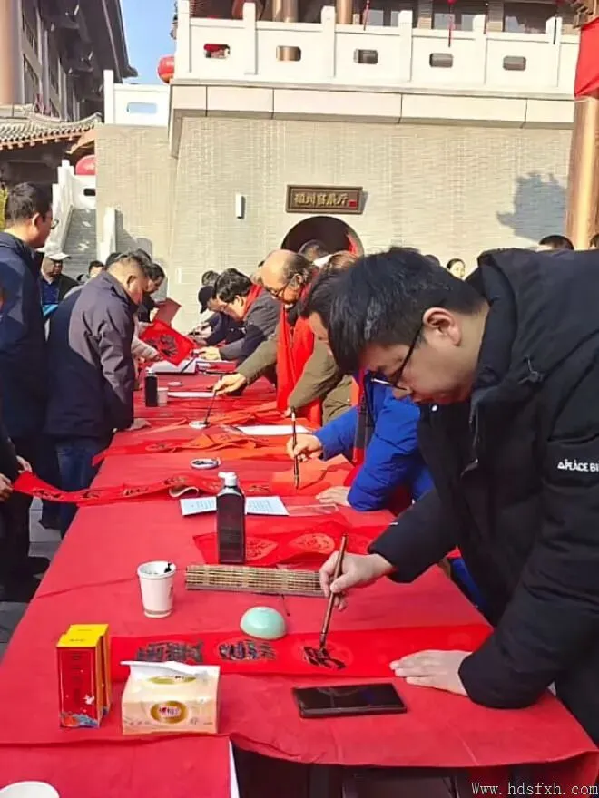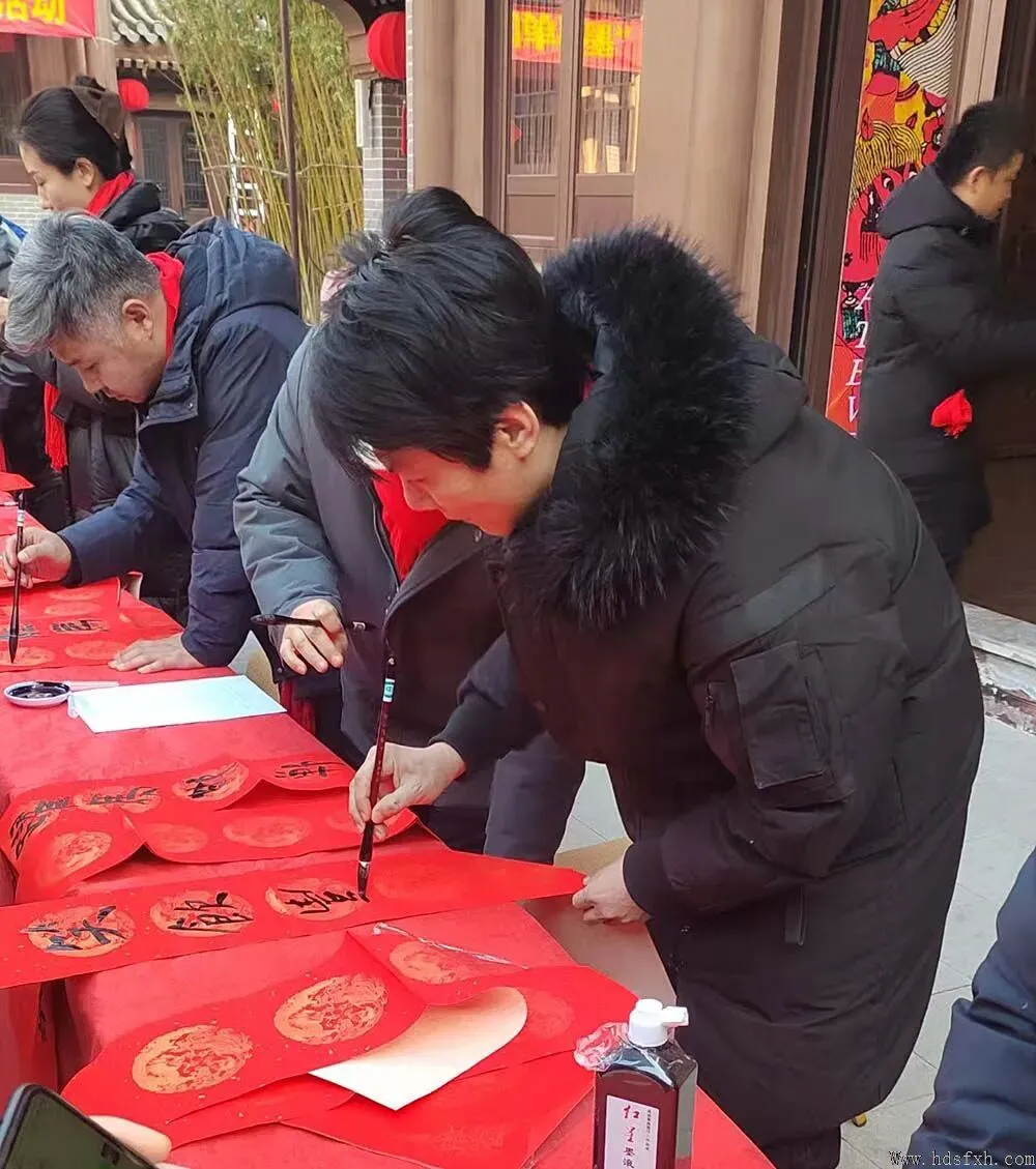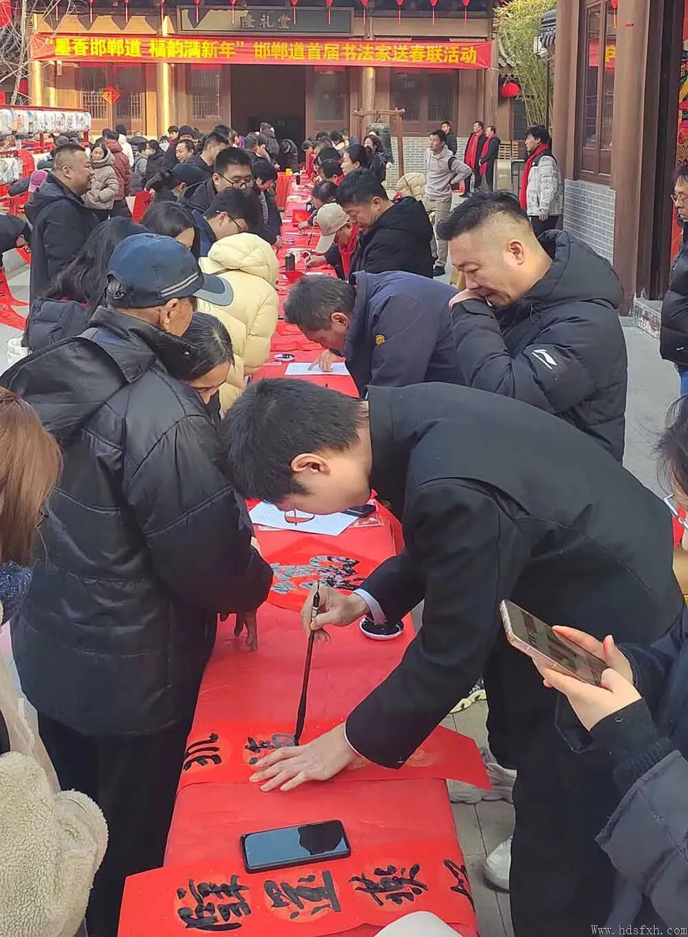 笔会环节,现场气氛热烈活跃。邯郸道的游客与商户们纷纷挑选心仪的春联词句,有序排队求字。书家们则凝神挥毫、泼墨抒怀,围绕新春主题,精心创作春联、福字800余幅,书法作品60余件。一撇一捺间,既有新春佳节的喜庆氛围,更饱含着对邯郸道蓬勃发展的美好祝愿。