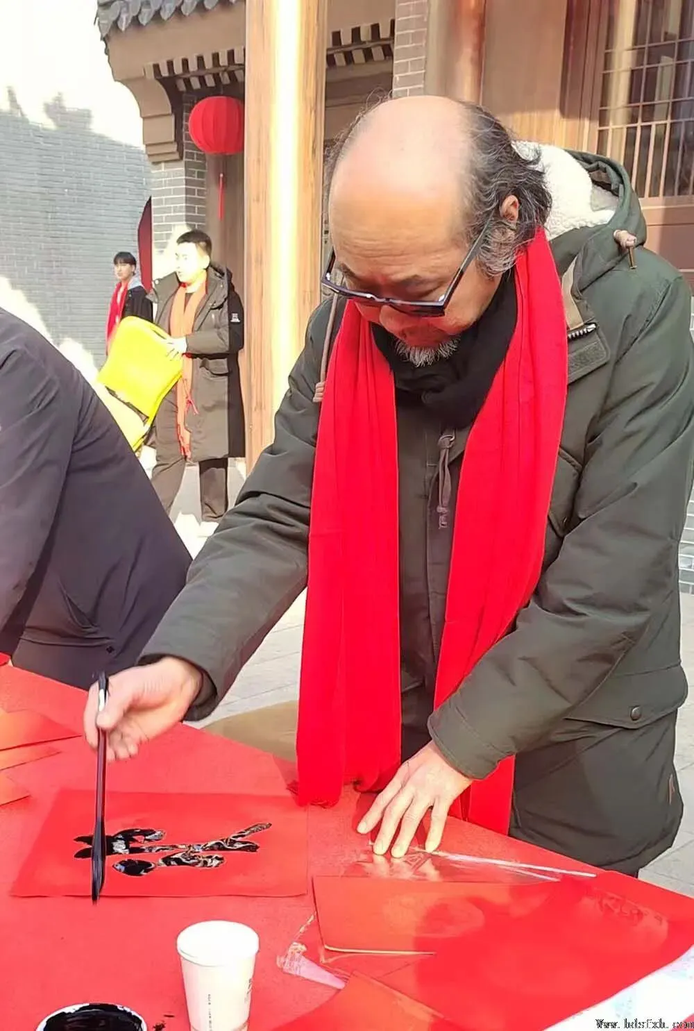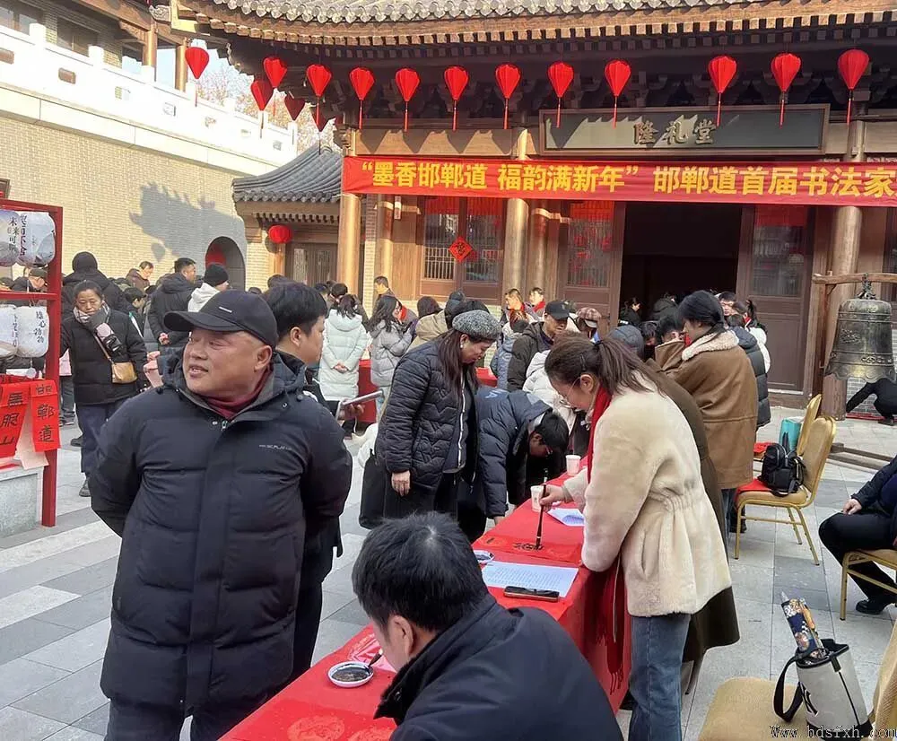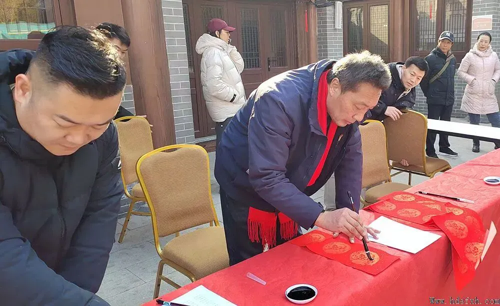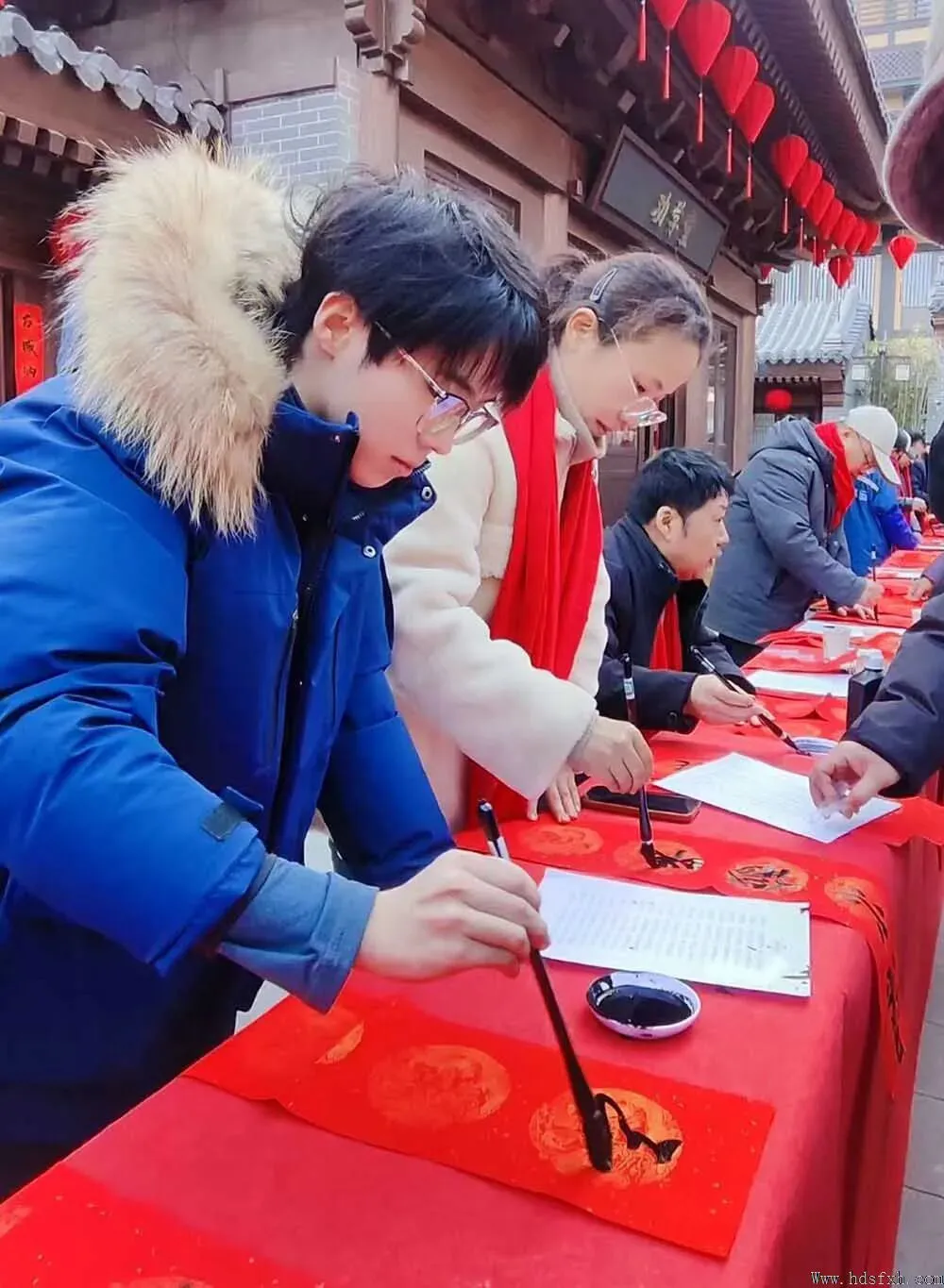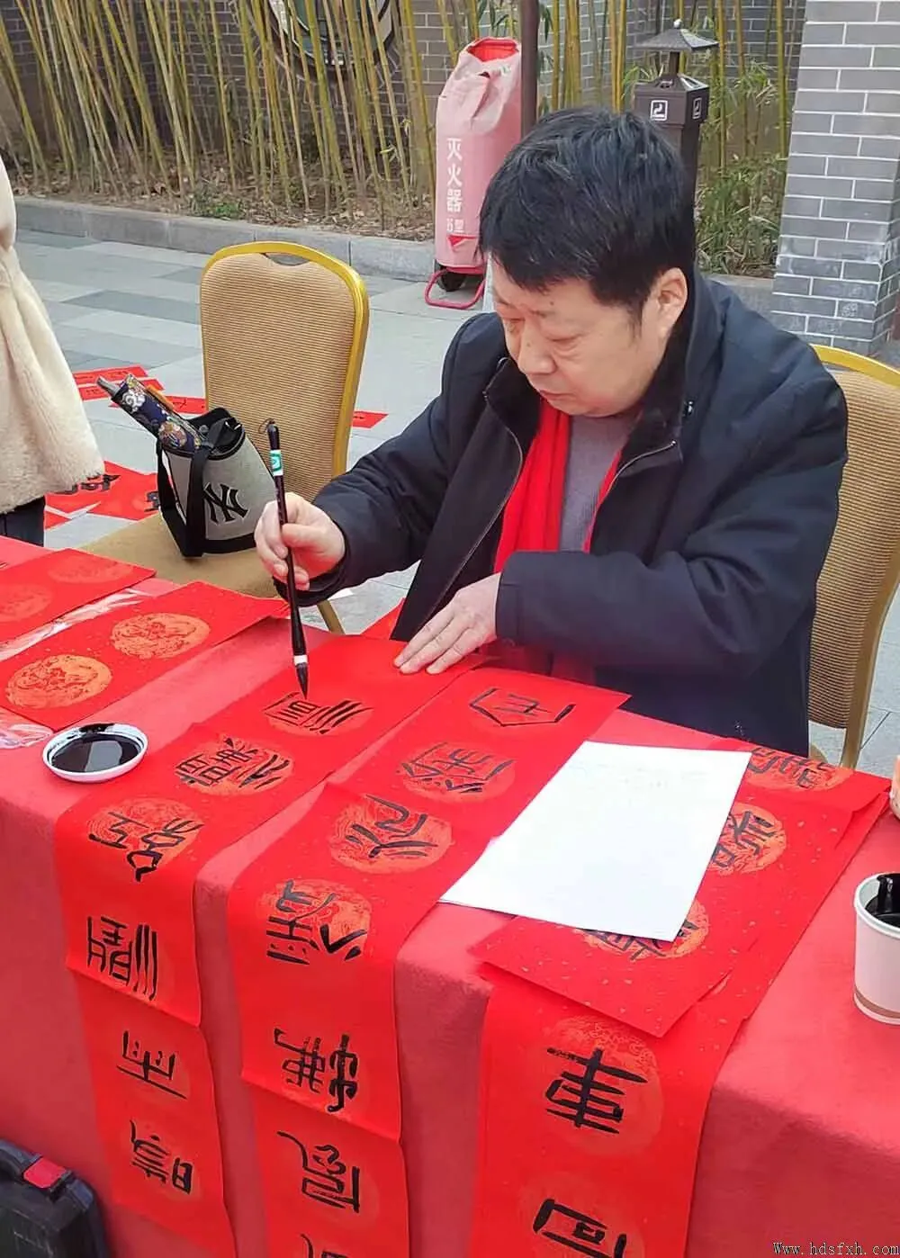笔会环节,现场气氛热烈活跃。邯郸道的游客与商户们纷纷挑选心仪的春联词句,有序排队求字。书家们则凝神挥毫、泼墨抒怀,围绕新春主题,精心创作春联、福字800余幅,书法作品60余件。一撇一捺间,既有新春佳节的喜庆氛围,更饱含着对邯郸道蓬勃发展的美好祝愿。