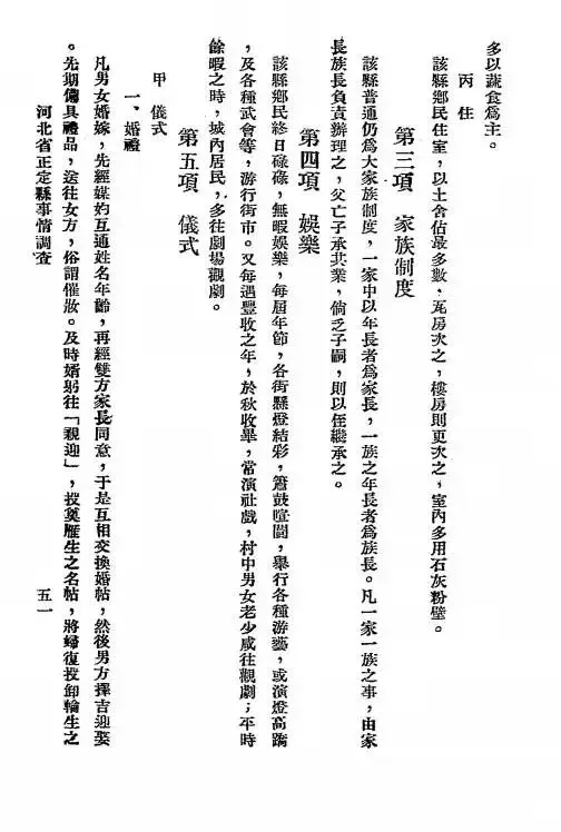 丙 住该县乡民住室,以土舍占最多数,瓦房次之,楼房则更次之,室内多用石灰粉壁。 第二项 家族制度该县普通仍为大家族制度,一家中以年长者为家长,一族之年长者为族长。凡一家一族之事,由家长族长负责办理之,父子子承父业,倘乏子嗣,则以侄继承之。 第四项 娱乐该县乡民终日忙碌,无暇娱乐,每届年节,各村悬灯结彩,箫鼓喧闹,举行各种游艺,或演登高跷及各种武术等,游行街市。又每逢丰收之年,於秋收毕,常演社戏,村中男女老少咸往观剧,不时闲暇之时,城内居民,多往剧场观剧。 第五项 仪式甲 仪式一、婚礼凡男女婚嫁,先经媒妁互通姓名年龄,再经双方家长同意,于是互相交换婚帖,然后男方择吉迎娶。先期备具礼品,送往女方,称谓催妆。及时婿躬往「亲迎」,投奠雁生之帖,将轿复投御轮生之