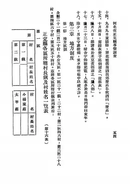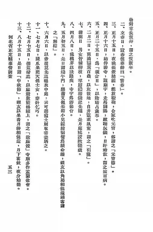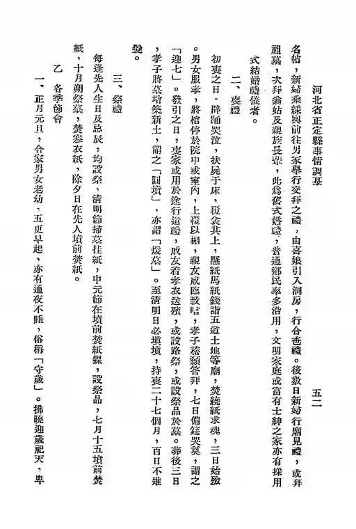 名帖,新婿乘舆前往与男家举行交拜之礼,由喜娘引入洞房,行合卺礼。数日后新婿行庙见礼,或拜祖墓,大拜翁姑及亲族长毕,此为旧式婚礼,普通乡民多沿用,文明家庭或富有士绅之家亦有采用新式结婚仪者。 二、丧礼初丧之日,踊哭泣,扶尸于床,覆衾其上,延请乡纸钱请五道士地等师,焚纸钱求魂,三日始殓。男女服孝,将棺停於院中或室内,上覆以棚,亲友咸临致唁,孝子稽颡答拜,七日僧徒哭奠,谓之「迎七」。发引之日,丧家或用於行遣,戚友着孝衣送殡,或设路祭,或赙祭品於路。葬後三日,孝子将墓封筑新土,谓之「圆坟」,亦谓「暖墓」。至清明日必填坟,持丧二十七个月,百日不婚娶。 三、祭礼每逢先人生日及忌辰,均设祭,清明插柳挂纸钱,中元节在坟前焚纸裸,设祭品,七月十五坟前焚纸。十月朔祭墓,焚寒衣,除夕日在先人坟前焚纸。 乙 各季节会一、正月元旦,合家男女老幼,五更早起,亦有通夜不睡,俗称「守岁」。拂晓迎接黄天,卑