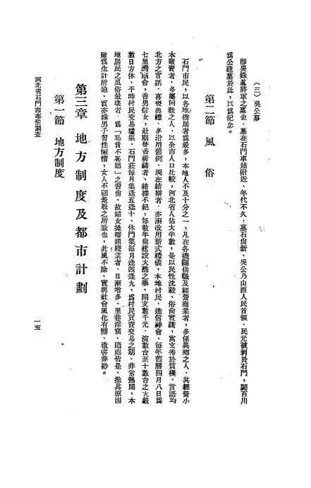 第二节 风俗石门市民,以各地侨居者为最多,本地人不及十分之一,凡在各机关供职及经营商业者,多系异乡之人,其经营小本贩卖者多,多属回教之人,以全市人口比较,河北省份较大数,盖以民性淳朴,俗尚节俭,寓劳於乐,渐染北省之新式习惯,享受欲望,亦随之而增高,然其勤俭之性,犹未稍改。每年旧历四月八日为碧霞元君诞辰,善男信女,此期香客络绎,络绎不绝,佛教自魏晋以来,即影响于北方各省,曩昔各大城七镇之商埠,皆有佛寺,石门距此仅四百余里,平日居民即崇信佛教,平日寺庙虽甚寥落,然每逢四月八日香客之期,各庙香烟缭绕,极为热闹。各处之商店,以妓女操贱业者,日将增多,里巷之间,隐蔽之处,能点然烟馆者,时有所闻,而卖淫之勾当,文人不敢登於纸笔,此风不除,直隶省会虽不文明,犹害非浅。
